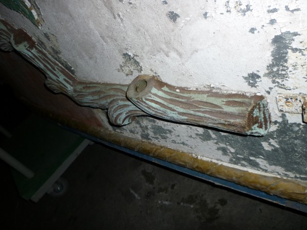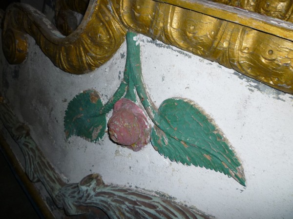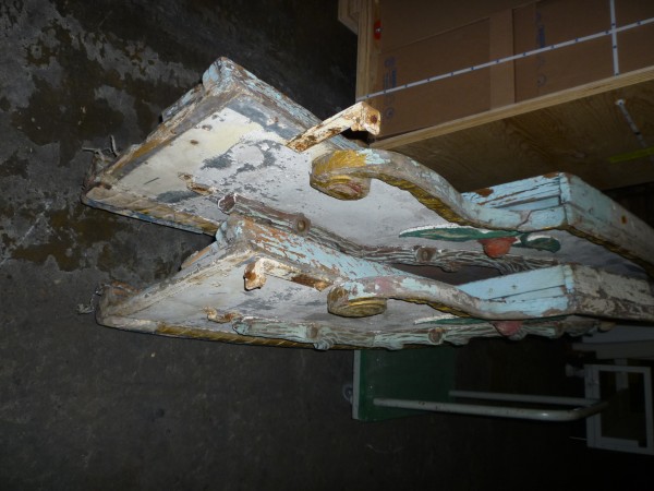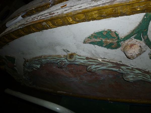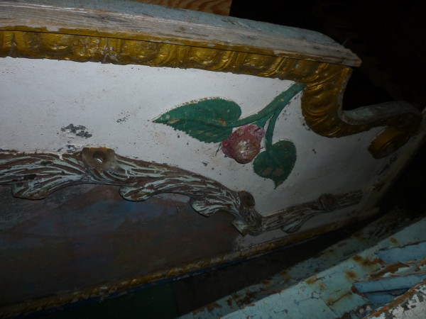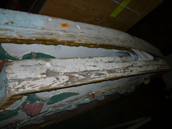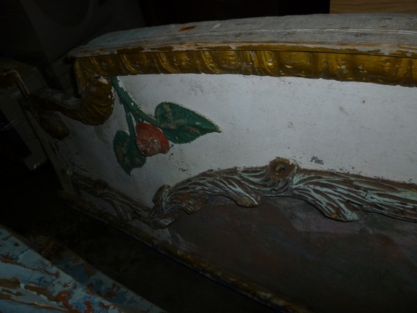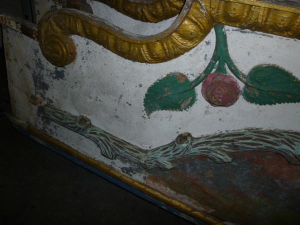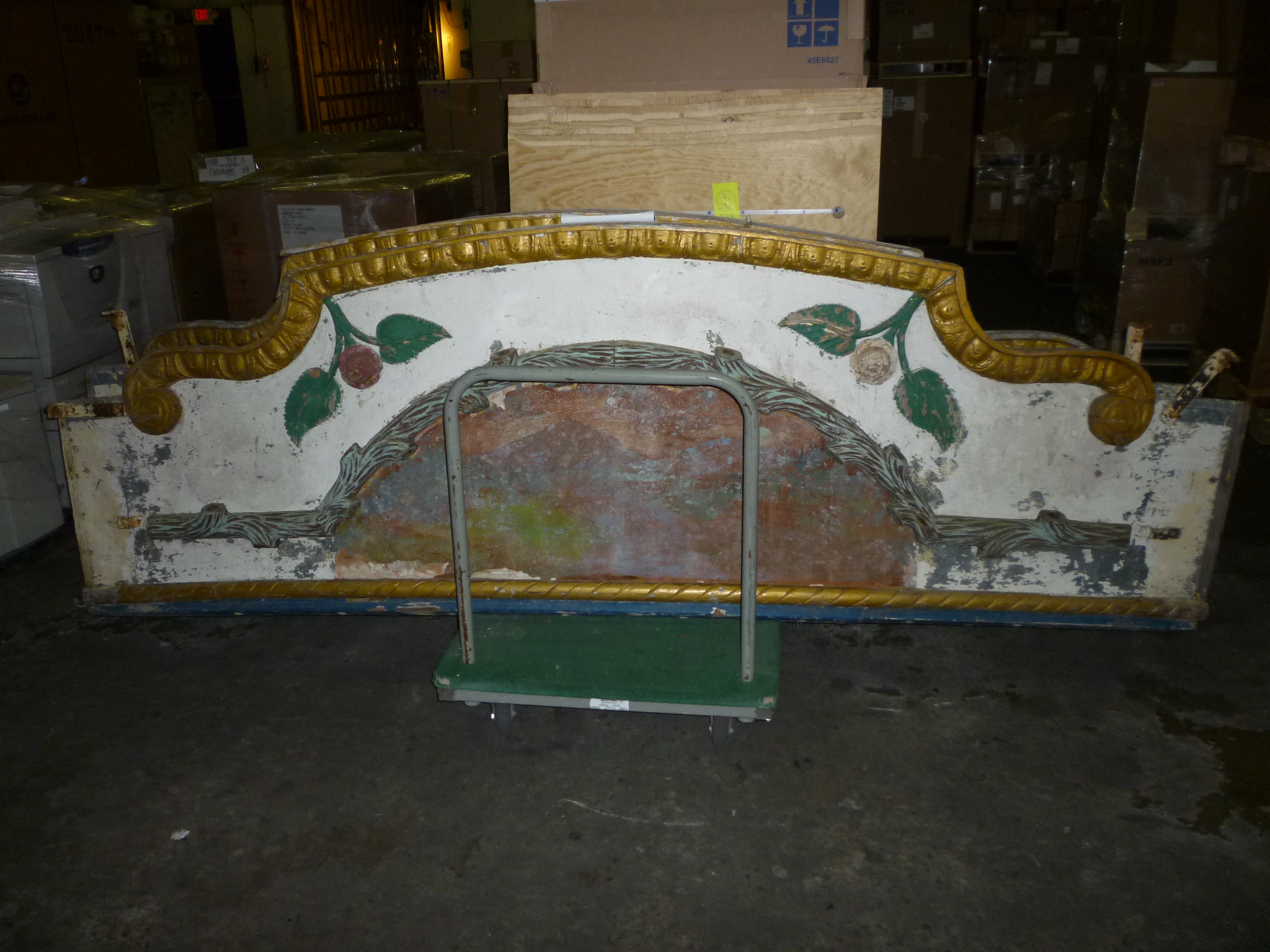 Antique 1920’s carousel rounding boards with light sockets measuring approximately 10′ long. Maker unknown but appears to be from a traveling carousel. Carved wood branches, flowered stems with leaves over metal backing. Both need restoration. Buy one or the pair. Makes a great project for any hobby or carousel enthusiast………