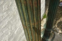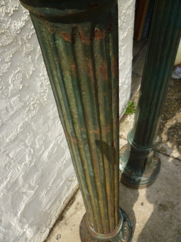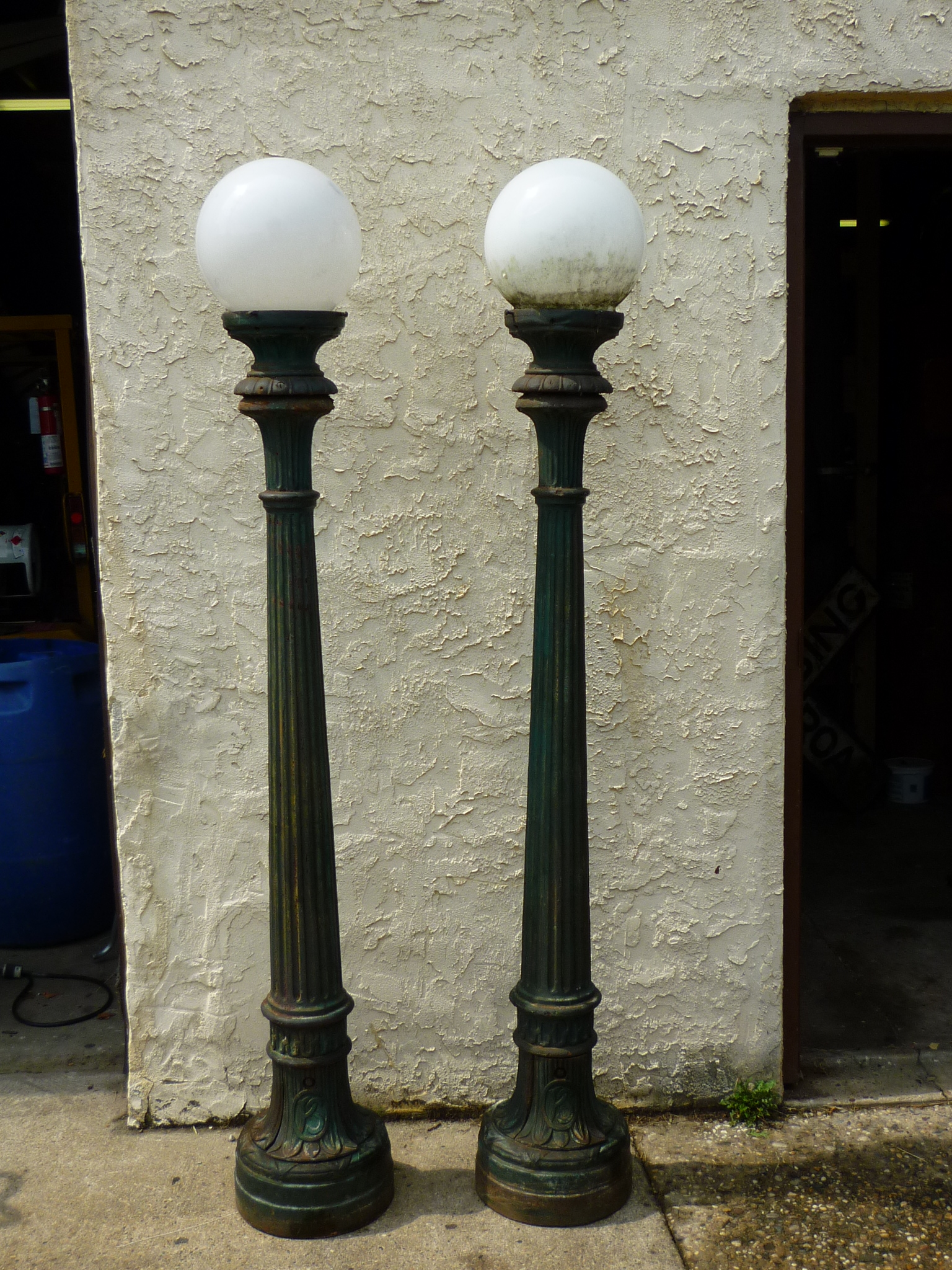 Pair of antique art deco cast iron city hall lamp posts in as found condition. Each post measures 70″ tall with a 12″ base and accepts a 8″ fitter globe. Signed “PS”. One globe is good the other has a slight crack. Would make a great addition to any landscape project. Sold as a pair only……….
