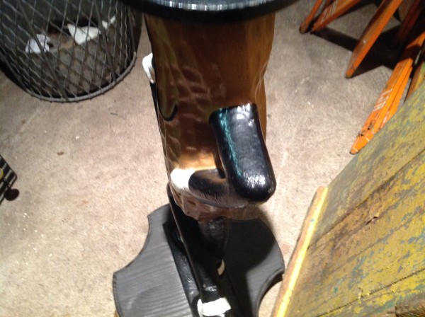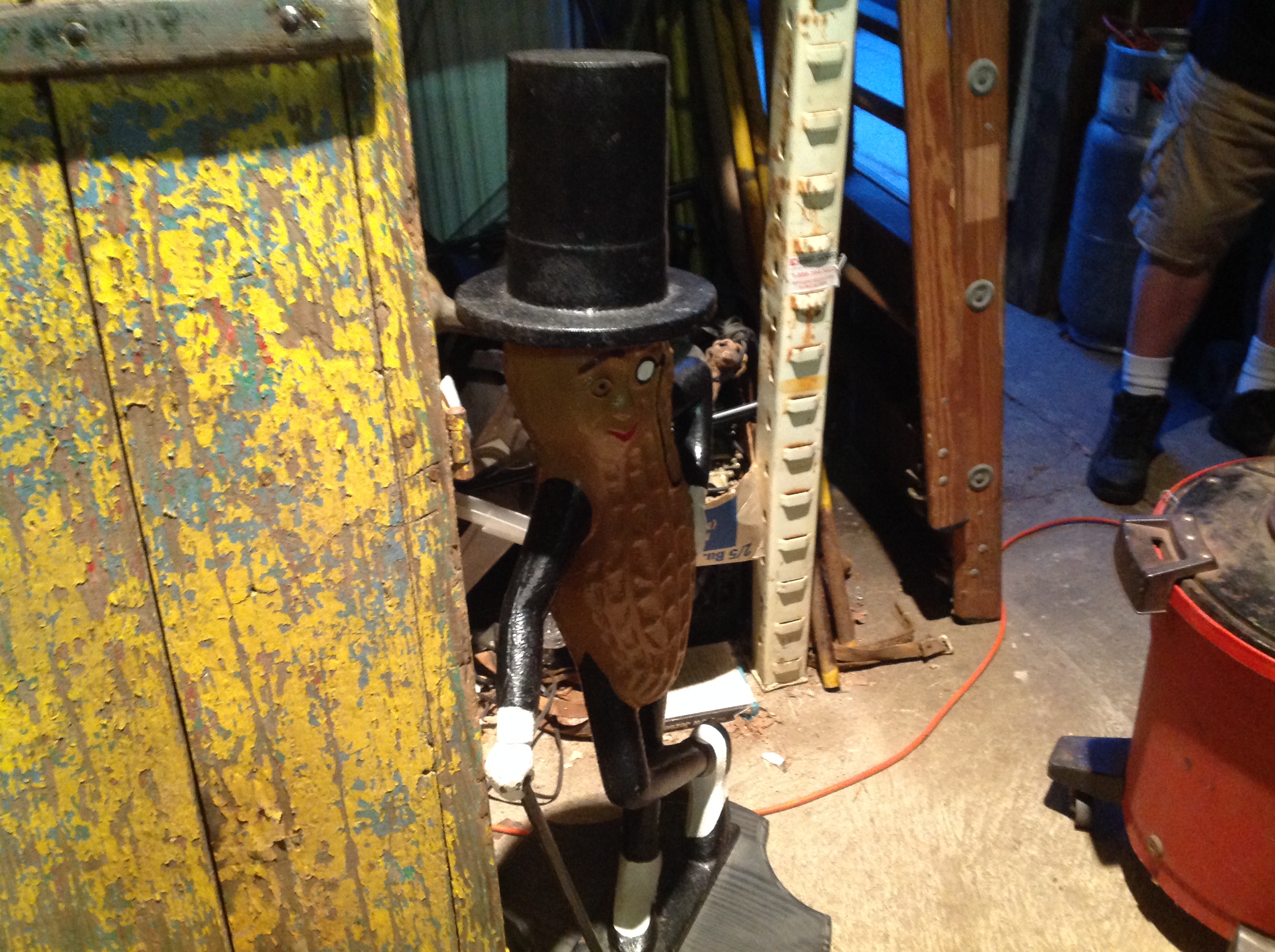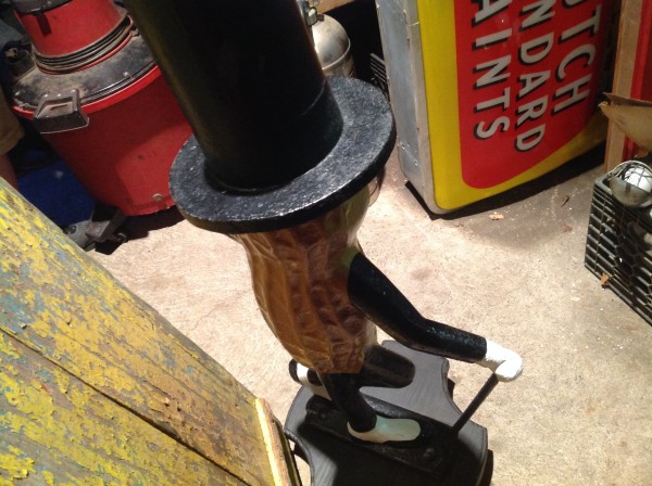 Authentic, original, antique cast iron Mr. Peanut fence post sitter in as found condition from the Planters Peanut building located on