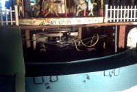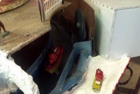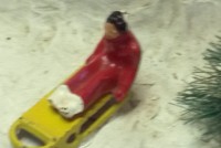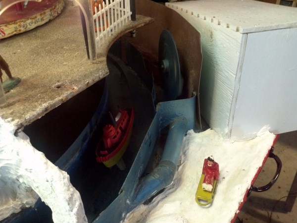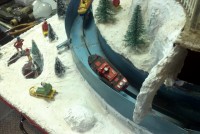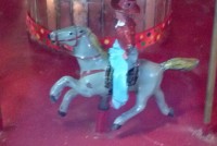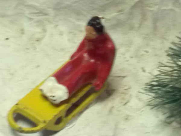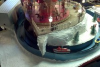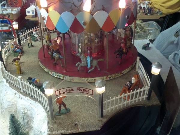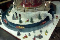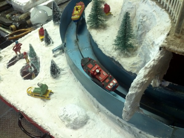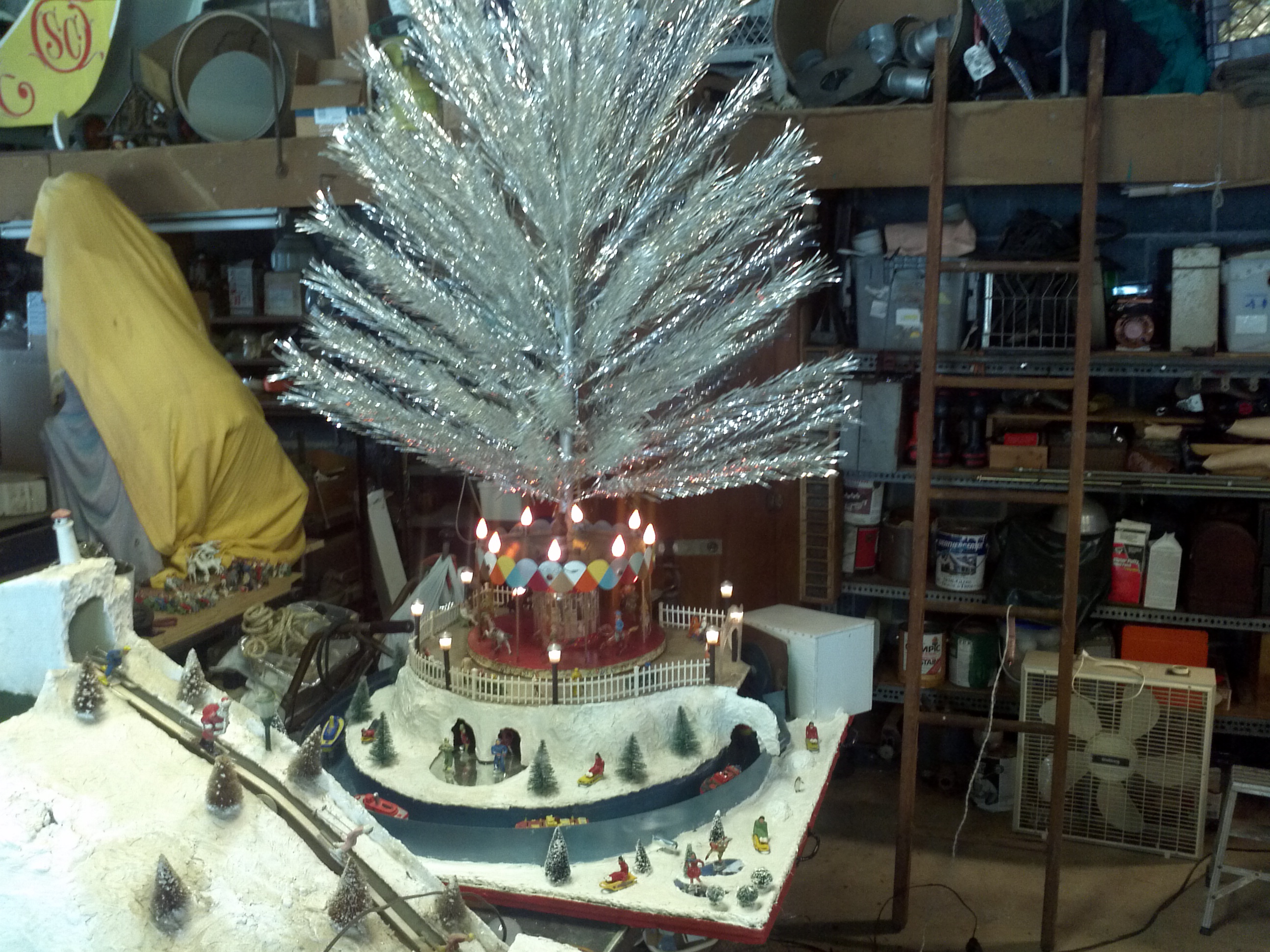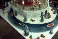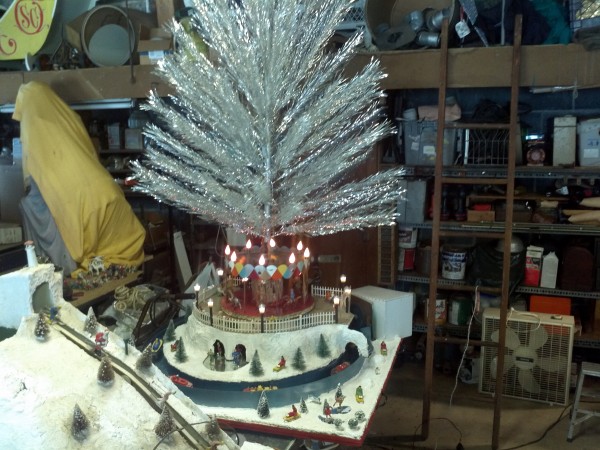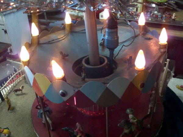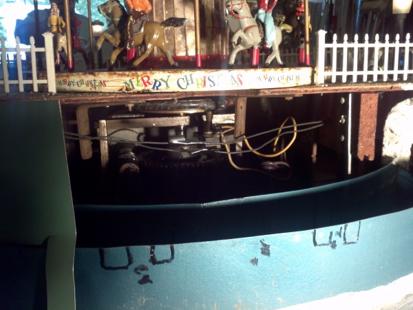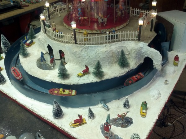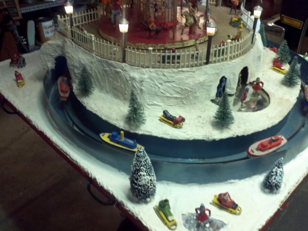 Very unusual hand made 1950’s folk art Christmas tree stand, animated with original silver tree with box. Boats move around the tree in water propelled by a hidden motor as the carousel rotates and the horses move up and down. Children also skate on a pond as it rotates inside and out of the tunnel. Base is 41″ x 44″ and 20″ tall. Street lights work and original metal figures adorn the whole snow scene. Just a wonderful example of one of a kind, custom made automatons…….