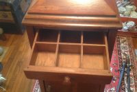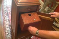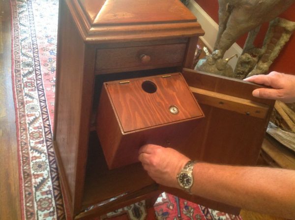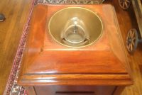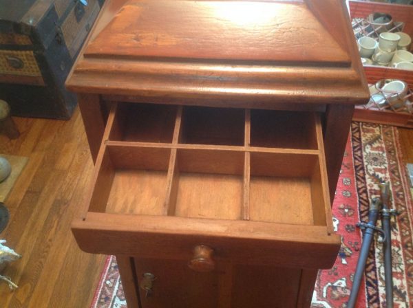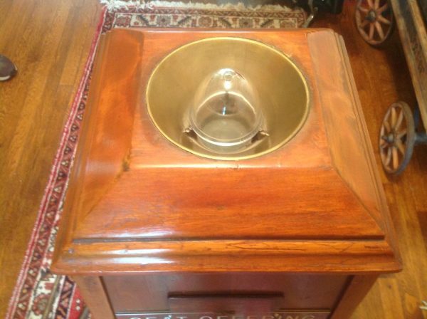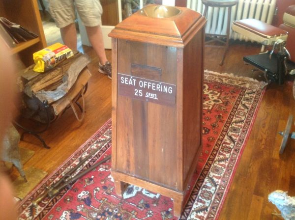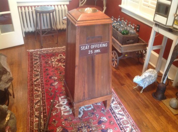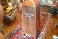 Unusual antique church seat offering cabinet in as found condition. Coins are deposited through a top glass dome and bills through a wood door on front side. Nice overall shape needing some glue tightening. Lock and key included……….