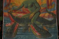 Antique canvas Circus/Carnival sideshow freak Strangest Creature banner in as found condition. Marked O’Henrey. Measures 192″ (16′) x 140″ (11.5′). Some minor canvas repairs needed.  Bright colors………..