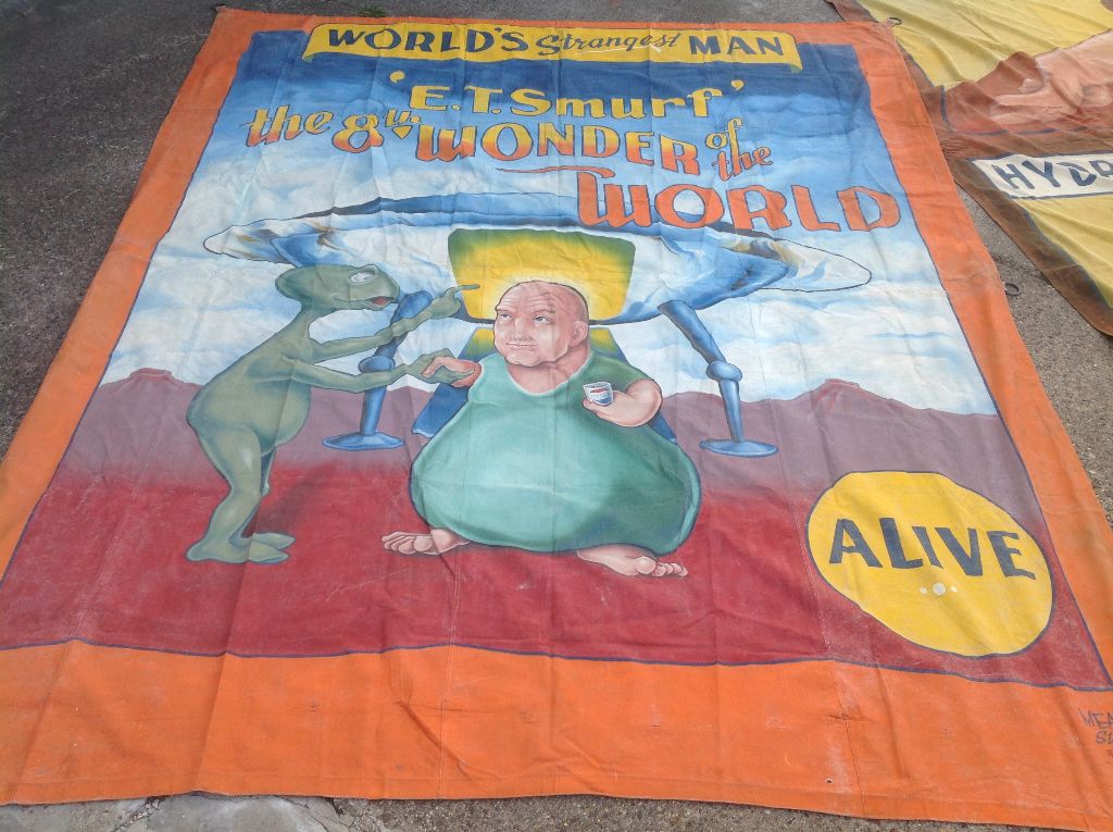 Large antique canvas circus/carnival sideshow freal banner Worlds Strangest Man E.T. Smurf 8TH Wonder Of The World in as found condition, signed by Meah. Measures a whooping 118″(10′) x 146″(12′). Small holes bottom of banner……..