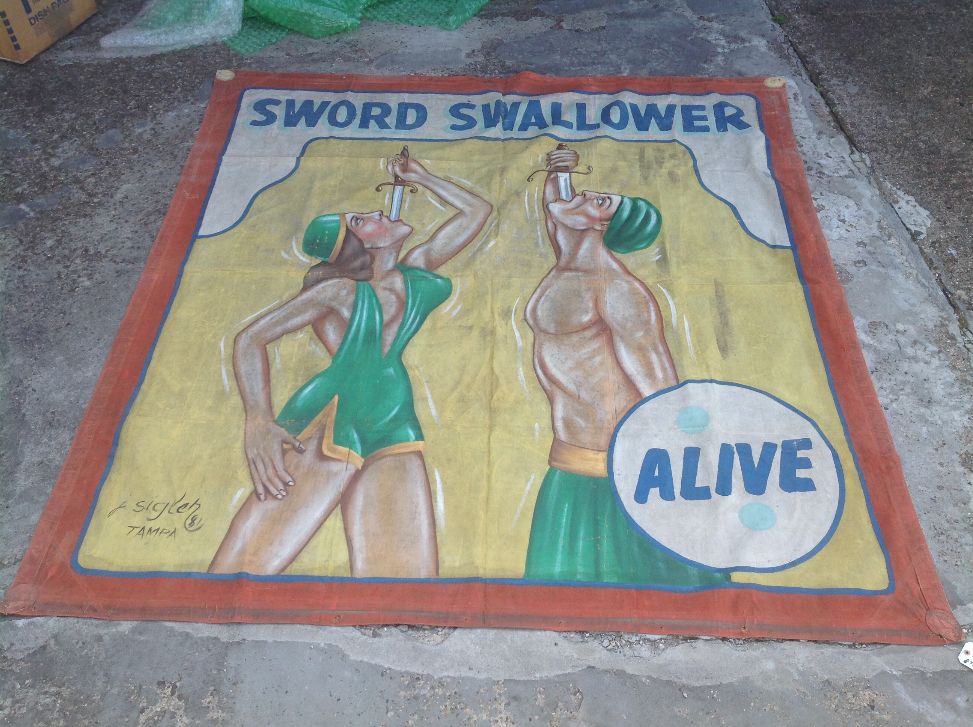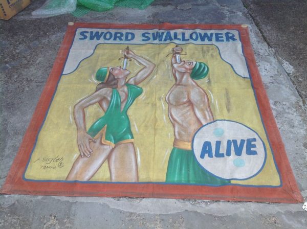 Antique canvas circus/carnival sideshow freak banner Sword Swallower in as found condition. Missing rings and measures 87″(7 1/4′) x 92″(7 1/2′) . Signed Sigler.