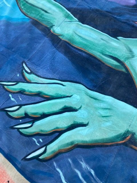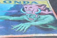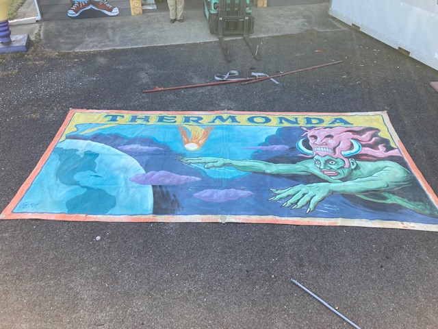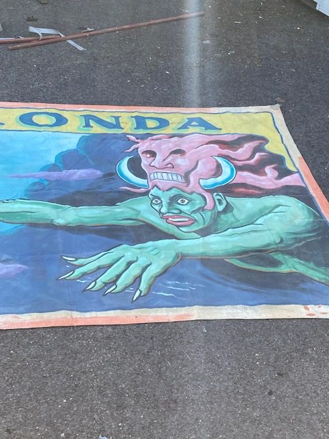 Another great antique circus/carnival freak banner from the late Jim Sigler collection painted by artist Snap Wyatt. Thermonda measures in at 18′ long x 9′ tall. Fantastic subject matter in overall good condition needing a new home………