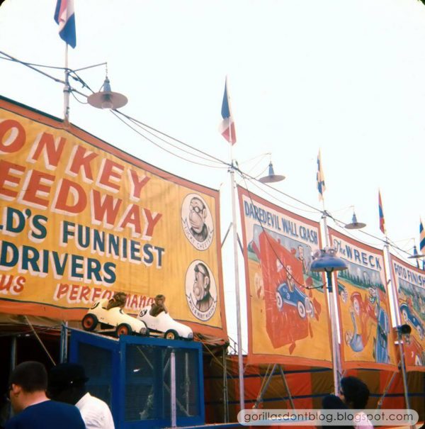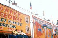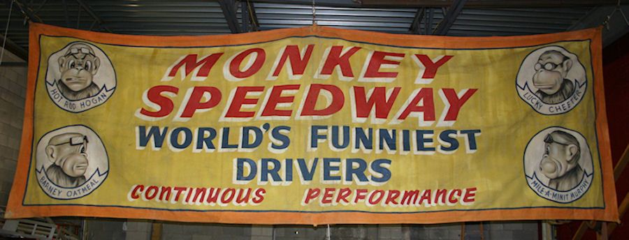 Antique canvas circus/carnival sideshow freak banner titled Monkey Speedway in as found condition. Banner measures 240″(20′) x 81″(6 3/4′) and has one hold center of “D”. Not signed but guaranteed to be a Wyatt. His style and subject matter. Pictured on a sideshow banner line 1960’s……….