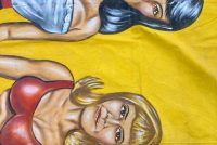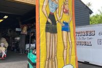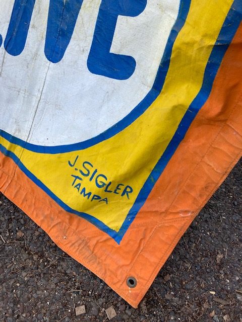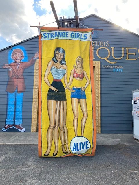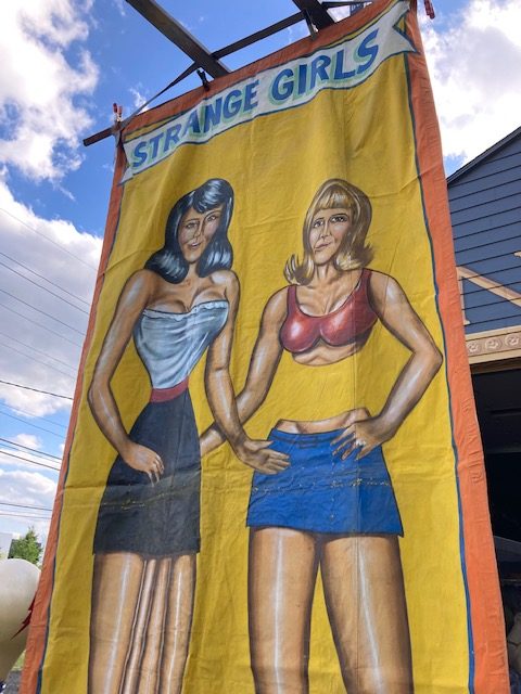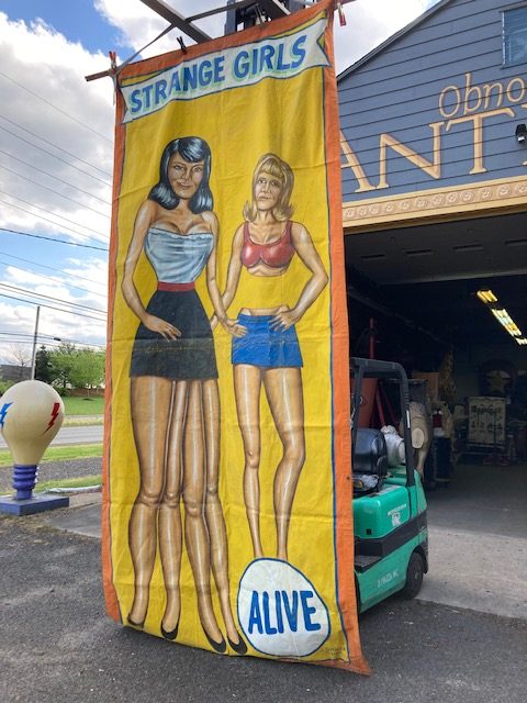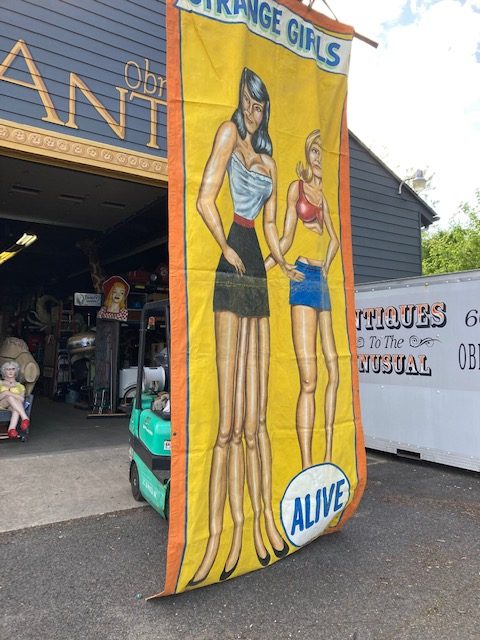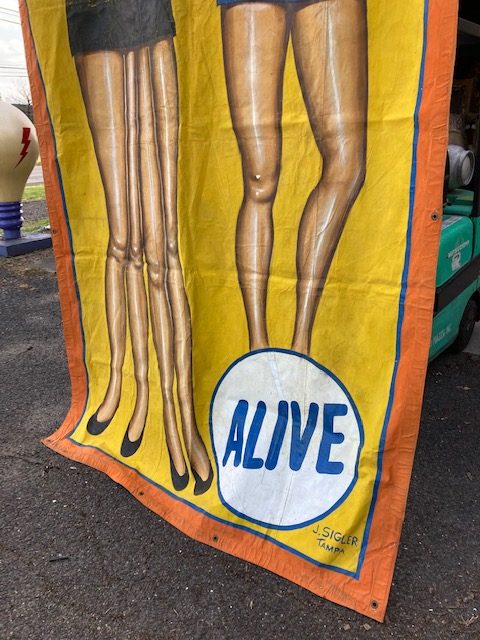Just found antique circus/carnival Strange Girl sideshow banner by artist J. Sigler in as found condition. Painted by Jim Sigler measuring 14′ 8″t tall x 6’4″ wide. Jim recently passed away after a long term illness making this banner available from his family. Just a wonderful banner needing a new home………….