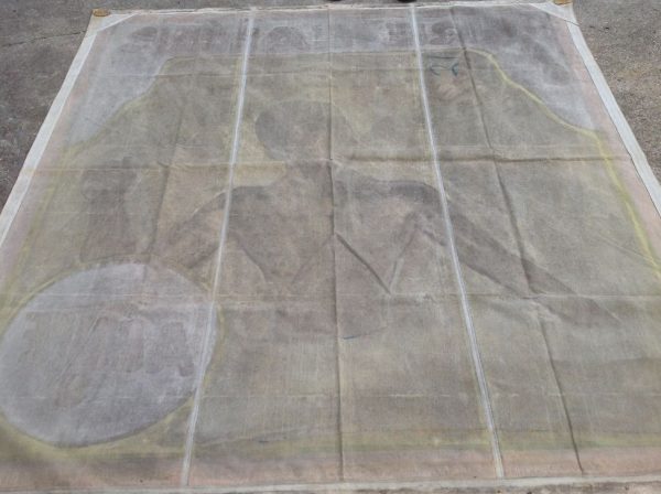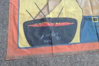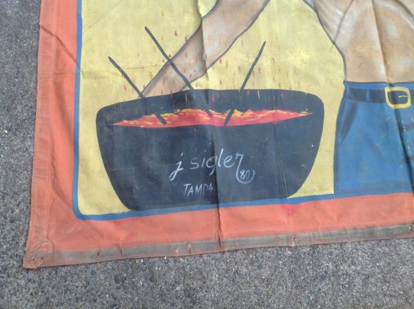 Antique canvas circus/carnival sideshow freak banner titled Fire Eater in as found condition. Measures 87′(7 1/4′) x 93″(7 3/4′). Signed by artist Sigler………