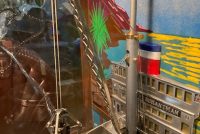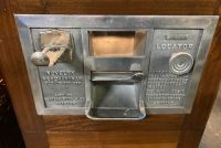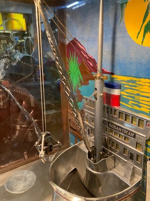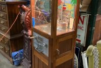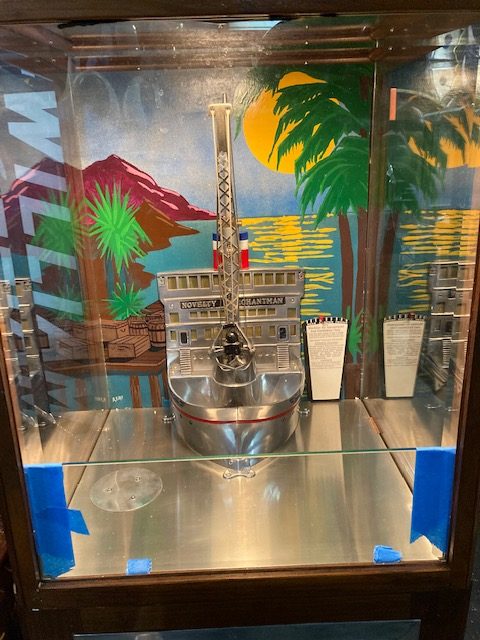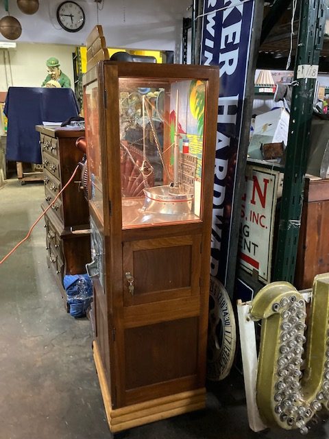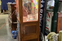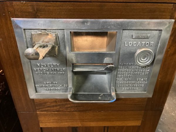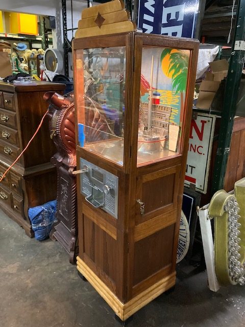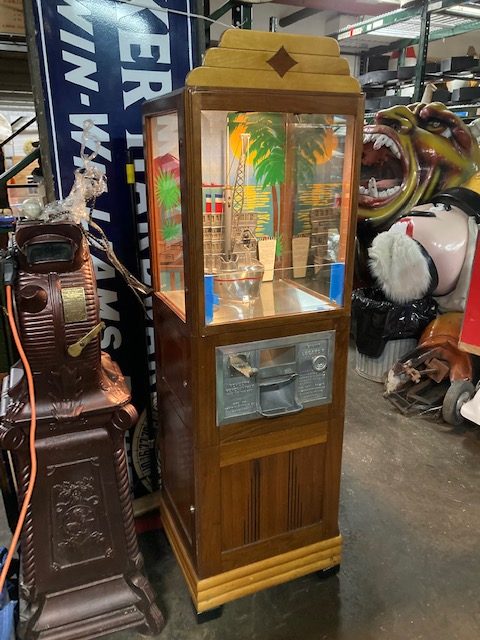 Antique Exhibit Supply coin operated penny arcade crane in working condition. Mostly all original but has been restored with a hand painted back mural. Clean example for years of fun……….