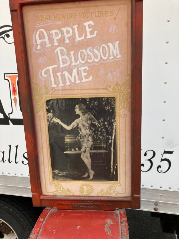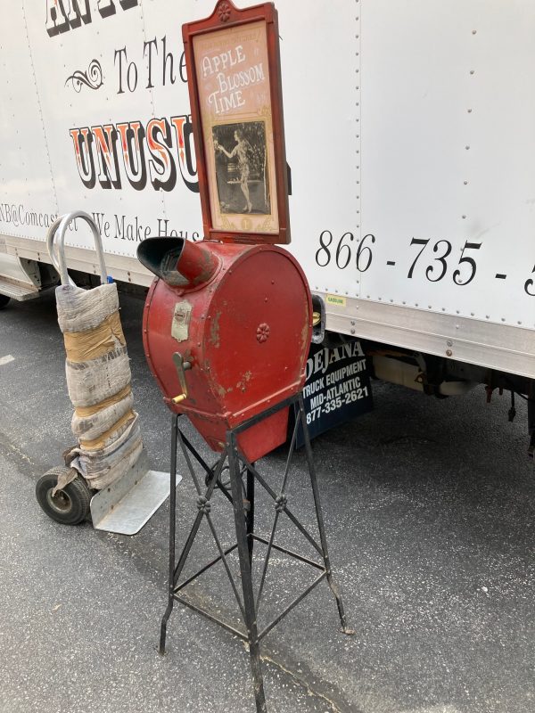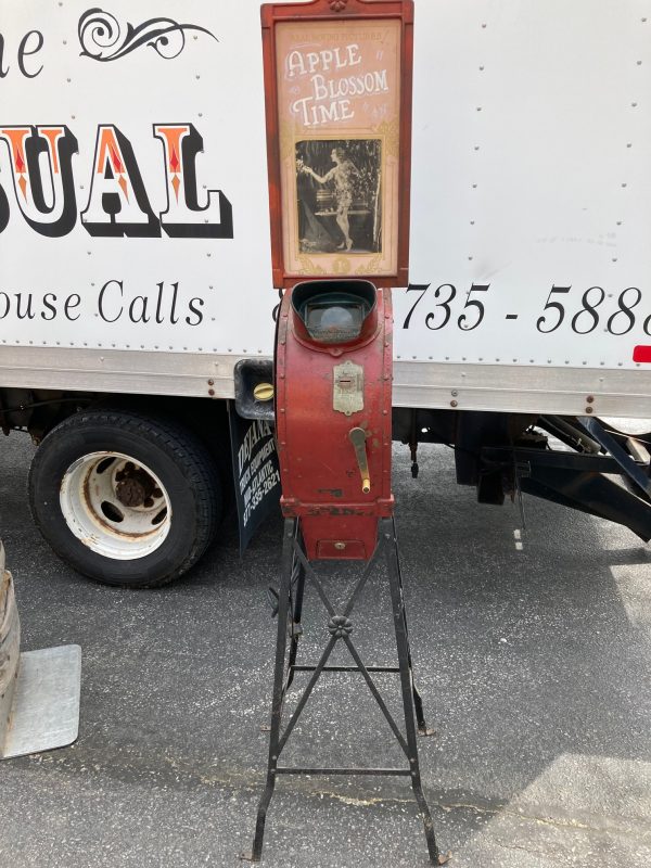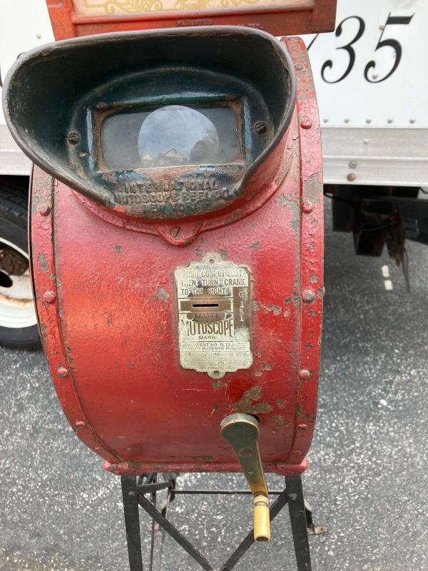 Antique coin operated tin sided penny arcade Mutoscope machine in as found condition. Working, no keys. Purchased from a massive collection of machines found along the Ocean City boardwalk, Ocean City, MD back in the early 1970’s. Complete and ready for your man cave or game room………..