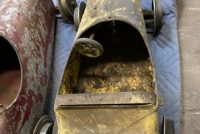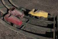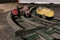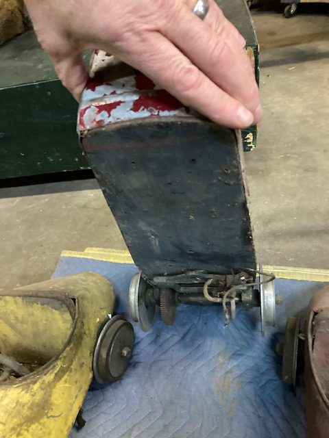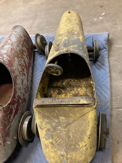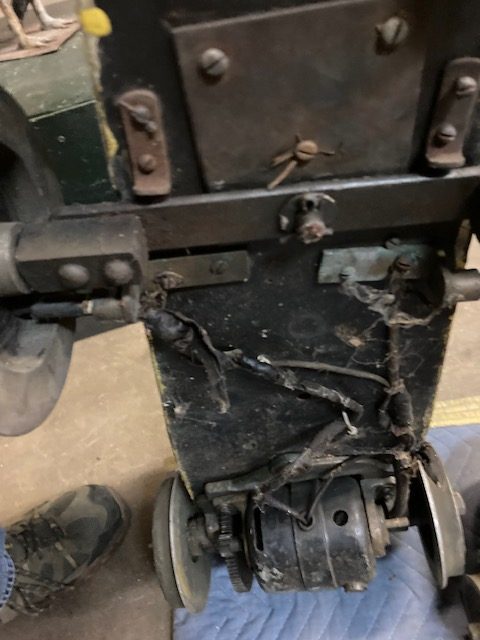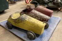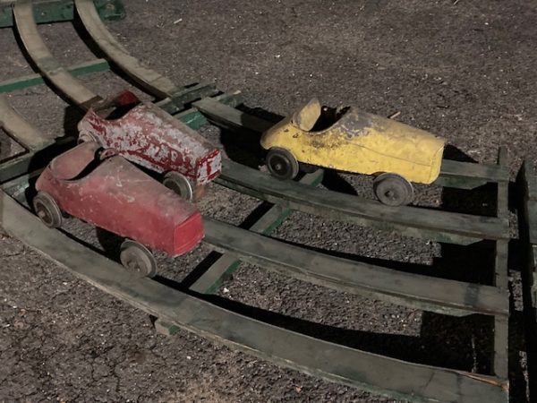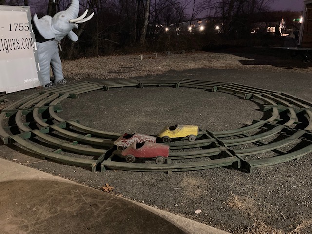 Extremely rare antique Cole Brothers Circus midway Monkey Speedway Race game with track in as found condition. Stored away for over 40 years until the original owner discovered the game in a trailer on his property recently in Upstate New York. Needing restoration but overall a great find for the right buyer. 3 cars, red one needing a front wheel and non functioning steering wheel fabricated along with a motor. The other 2 cars look to be complete as far as we can tell. The track will need some work as the copper track lining is coming loose in some spots and will need to be replaced in other spots. Comes complete with foot pedal and wood supports. Not tested, so you are buying it “as is”. You may never see another set as complete as this one. All you need are the Monkey’s to make this complete. Interested, call, text or email with questions………..