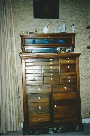 Nice vintage oak dental cabinet measuring 35″ wide x 12″ deep x 55″ high in as found condition. Glass drawer pulls, spandral glass top and marble bottoms. Could use a good polishing to bring out the patina but otherwise in very good condition. Has that dental smell that makes it original…….