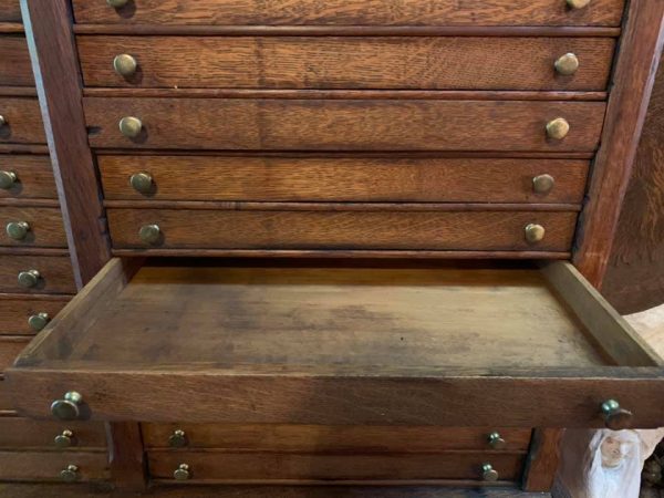 Antique oak display cabinet built by Exhibition Showcase Company in as found condition. Beautiful condition from a wonderful estate Pocono, PA. All it needs is a good polishing……….