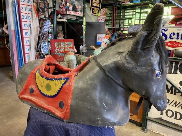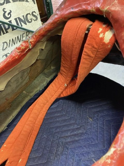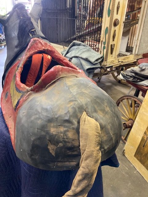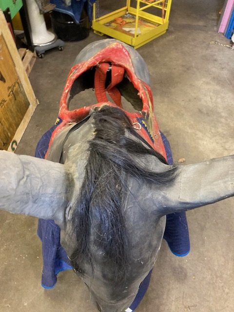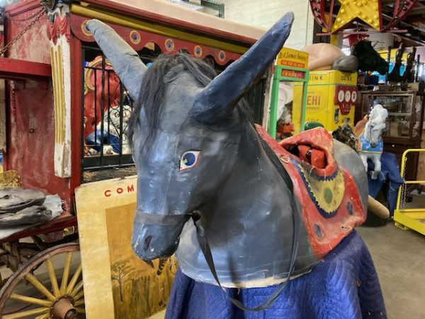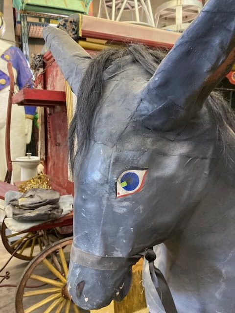 Vintage antique paper mache Donkey Jackass costume from A,T. Jones & Sons Baltimore, MD in as found condition. Nice condition for its age showing sign of wear. Made by A.T. Jones back in the 1950’s. A.T. Jones was the oldest costume and prop shop on record dating back to 1868. Google the company for more interesting history. Company closed recently giving us the opportunity to purchase some of the oldest costumes they had for rental. Don’t miss this opportunity to own a real piece of History………..