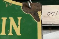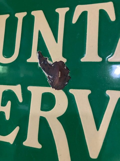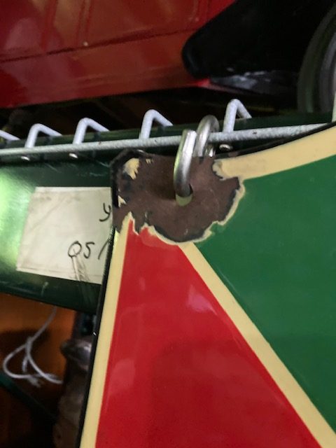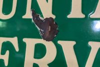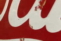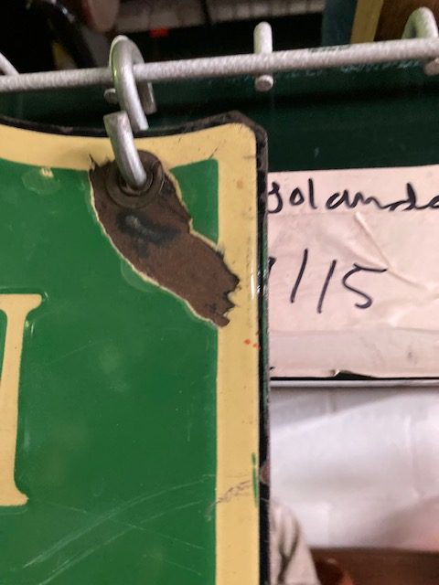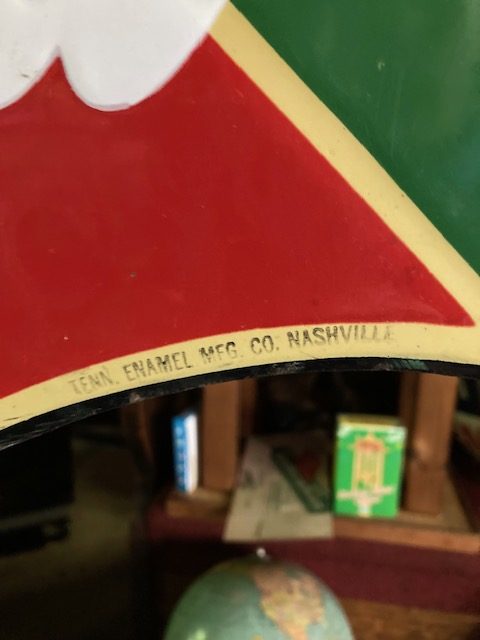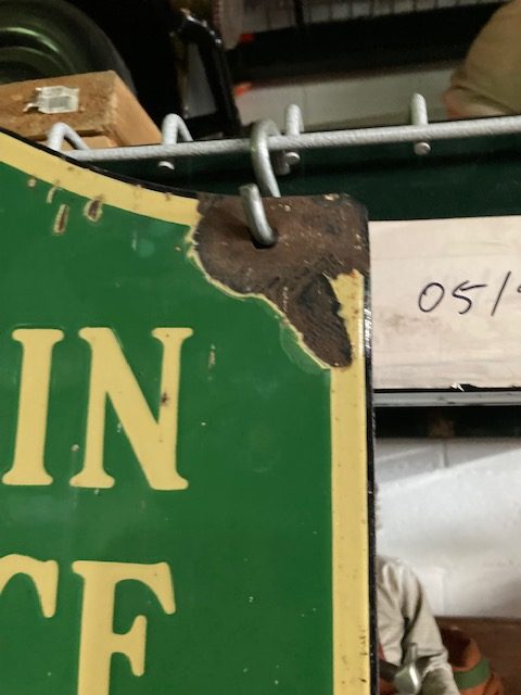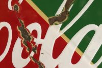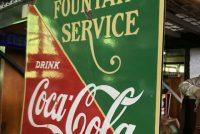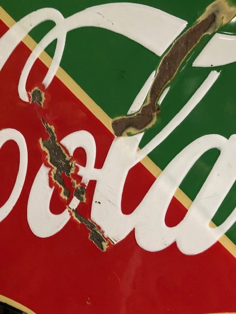 Antique double sided porcelain fountain service Coca Cola sign in as found condition. Sign measures 25 1/2″ tall x 22 3/4″ wide showing some chips as shown in the photo’s attached. Bright colors. Nice addition to your Coke collection……….