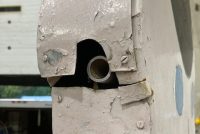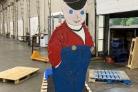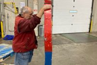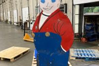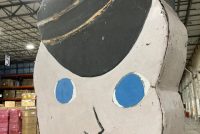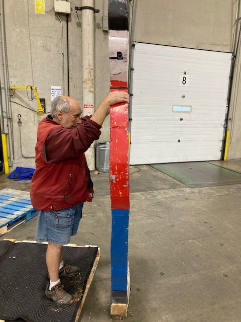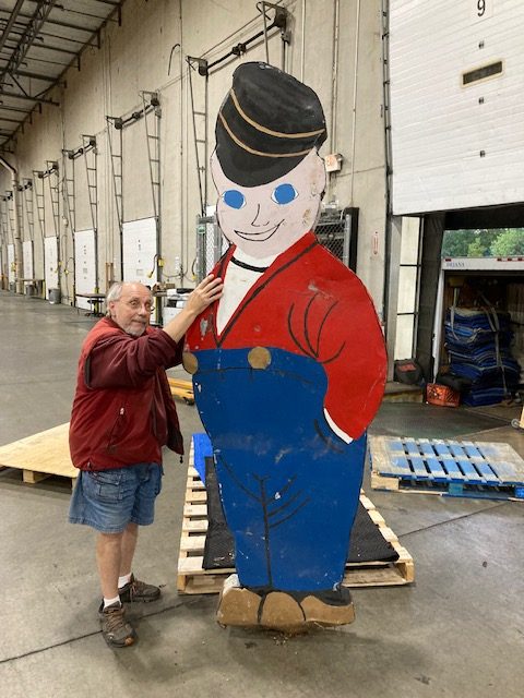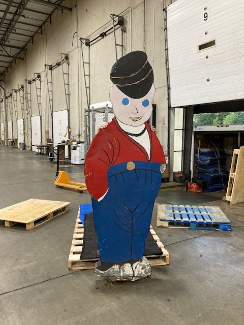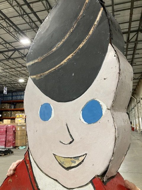 Antique double sided tin railroad conductor trade sign in as found condition. Painted sign with some minor bends at the feet needing some restoration. Measures over 9′ tall. Heavy weight and well constructed…………..
