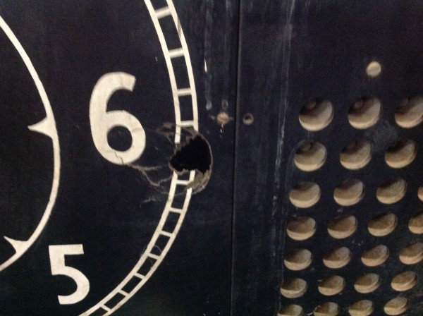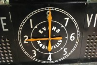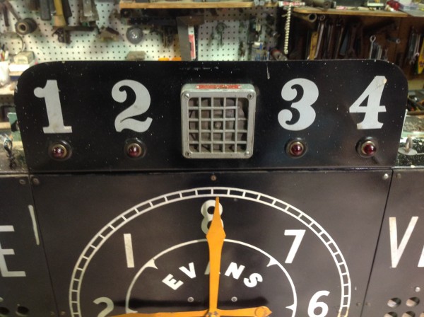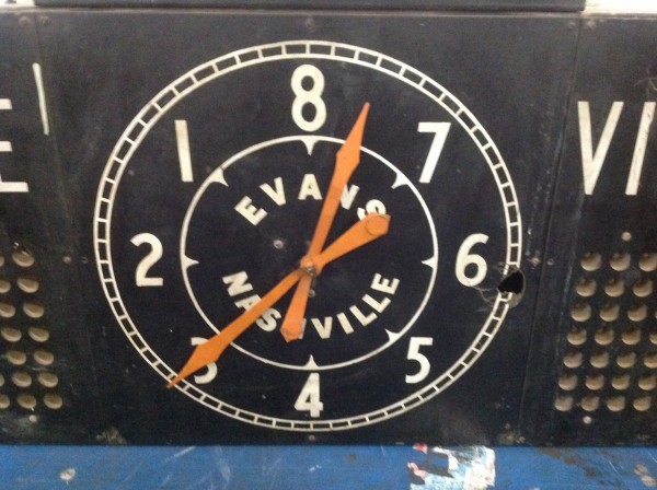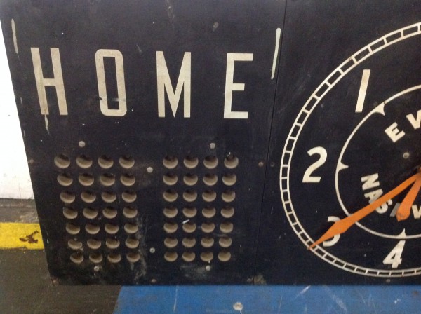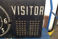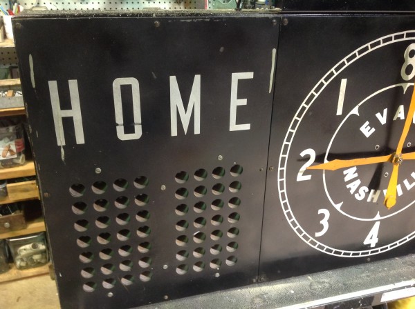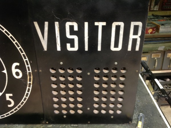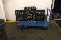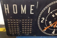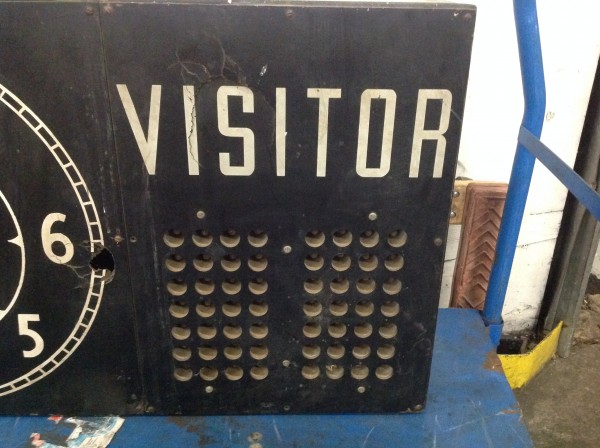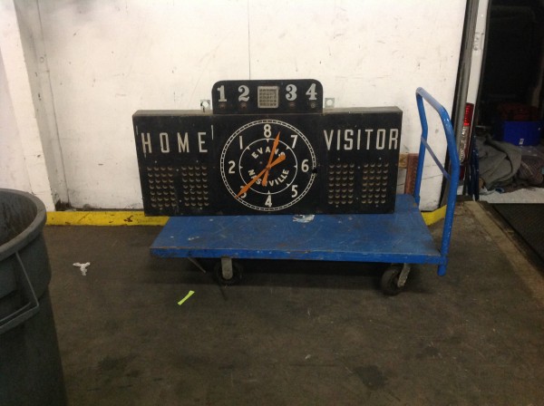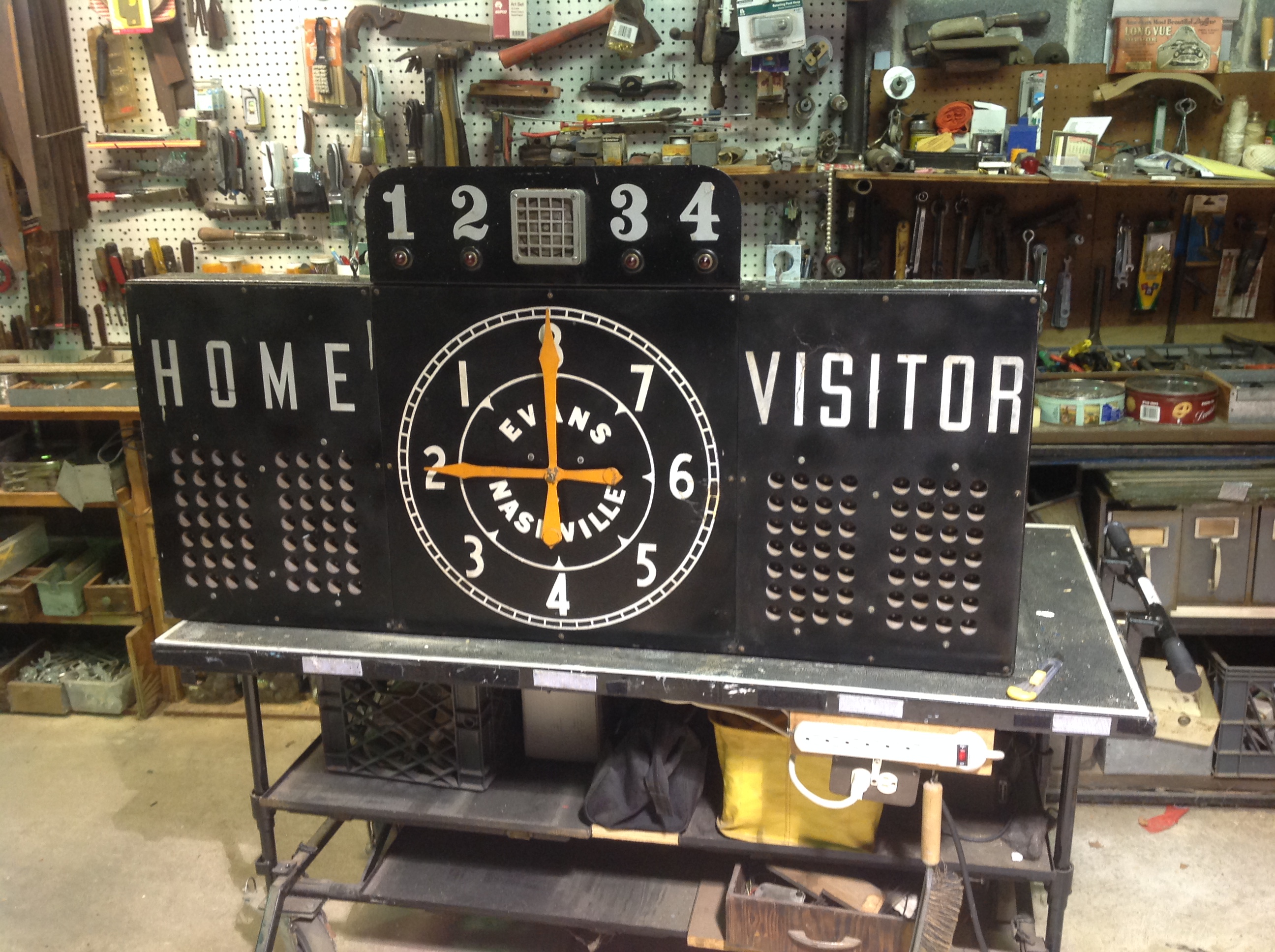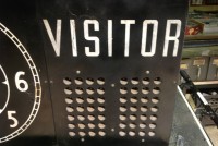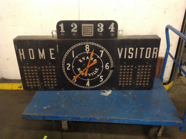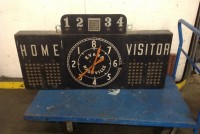 Wonderful old antique Evans Nashville basketball scoreboard in working condition. With the exception of a few burned out #47 bulbs this scoreboard functions and will provide good service. The clock works counting down the minute and seconds until the next quarter. Some minor blemishes but overall a very exceptional piece………