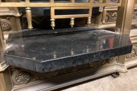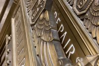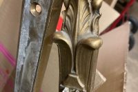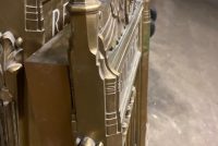 Antique First National Bank of North Hampton Massachusetts bronze teller window in as found condition. Measures 54″ wide x 42″ tall complete with sided glass panels and supports. Heavy bronze construction only needing a good polishing…….
