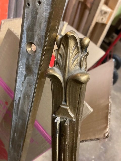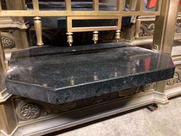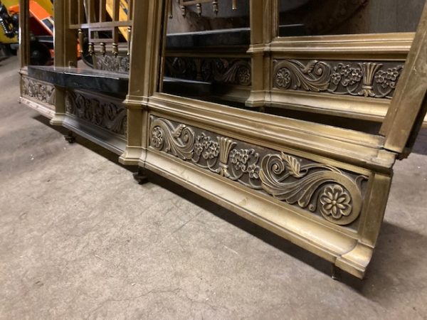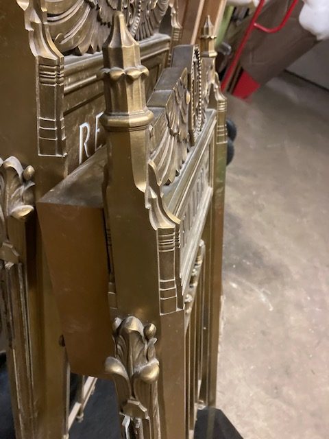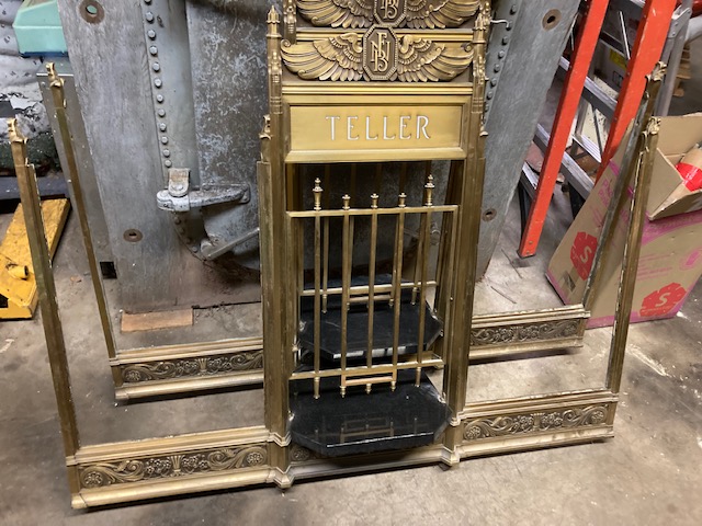 Antique First National Bank of North Hampton Massachusetts bronze teller window in as found condition. Measures 54″ wide x 42″ tall complete with sided glass panels and supports. Heavy bronze construction only needing a good polishing…….