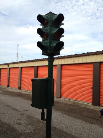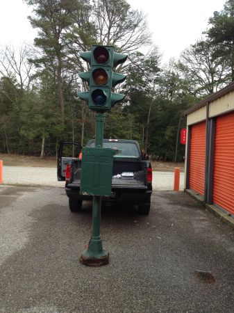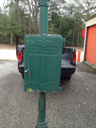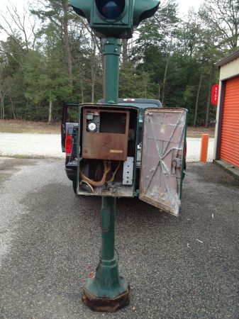 Massive cast iron four way street intersection traffic light measuring over 10′ tall in as found condition. Will need some minor welding of top light but otherwise in good condition. Comes complete with key. Will make a great garden ornament or just to keep traffic flowing at your next party…….