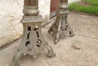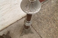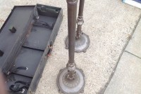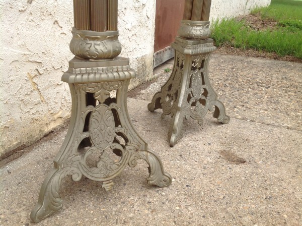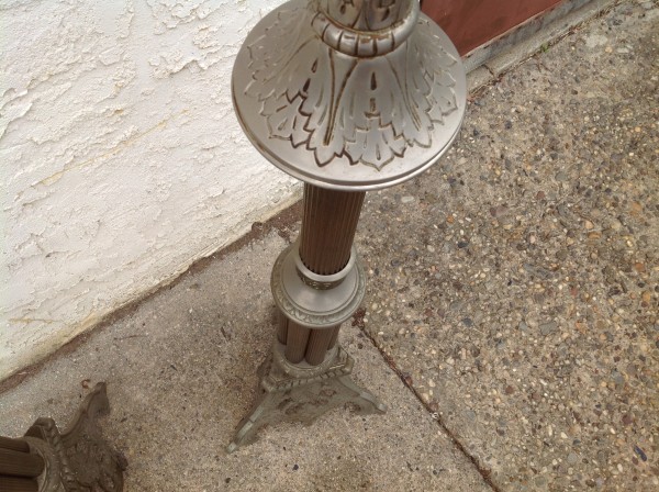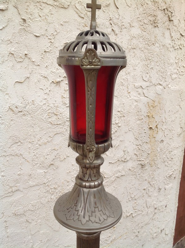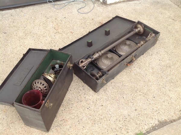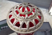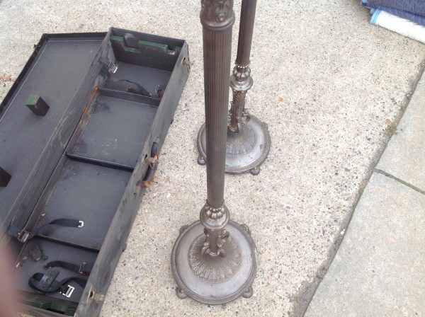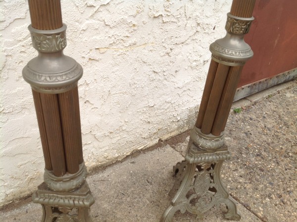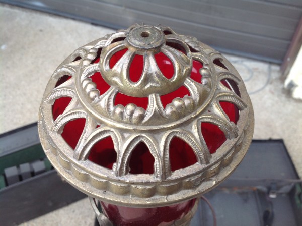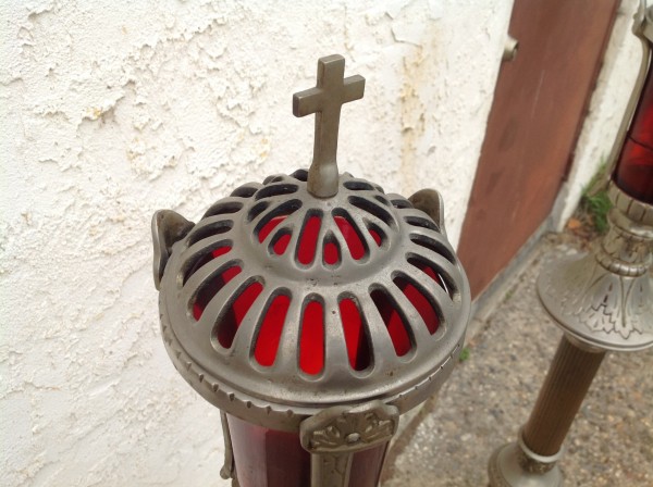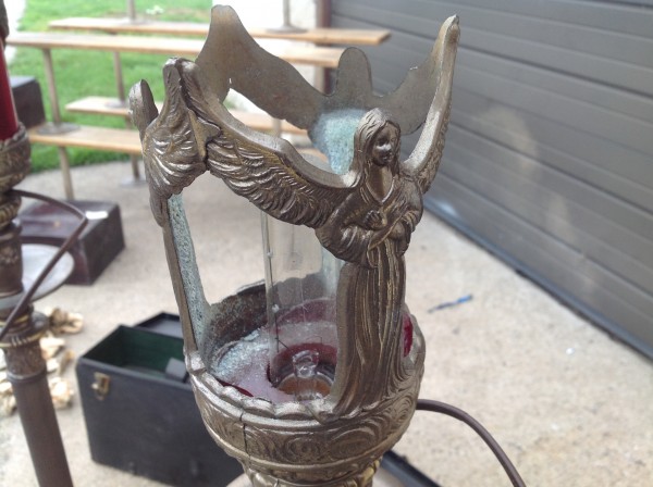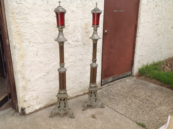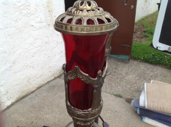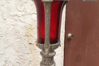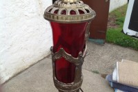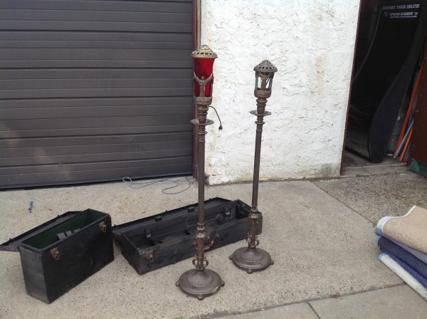 Antique funeral parlor torches in as found condition. All original but ruby red glass inserts are cracked and will need replacement. Used when funerals were conducted at home………….