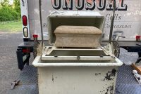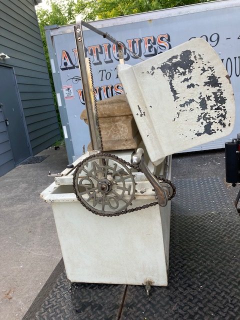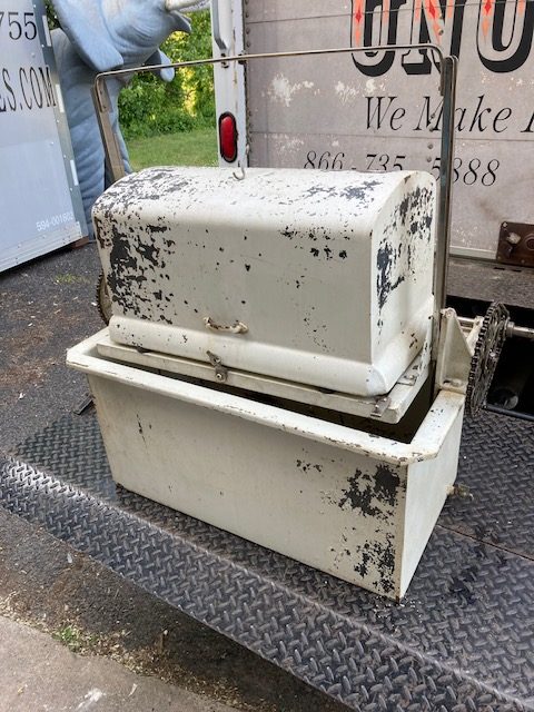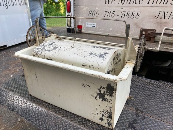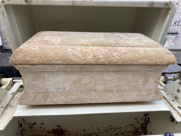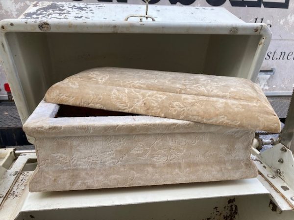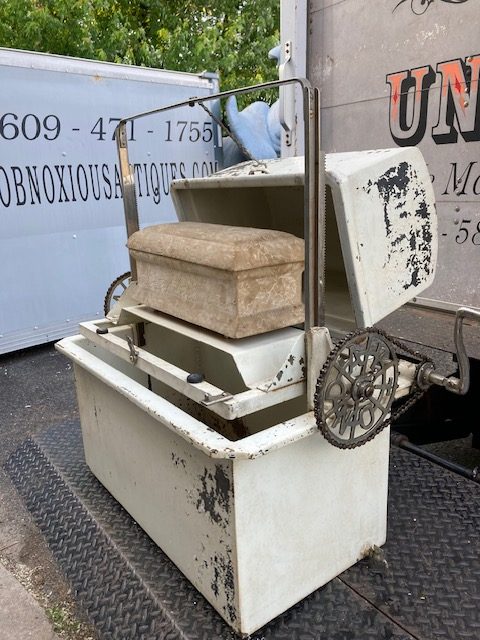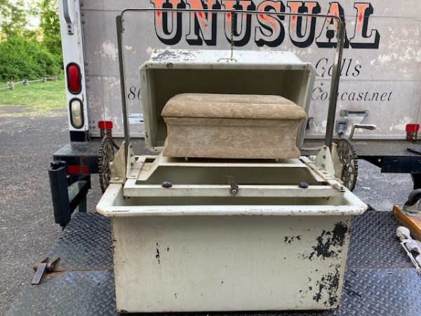 Unusual antique funeral polar graved burial vault mechanical salesman sample automaton in as found working condition. Ask to see video if interested by phone, text or email. Wonderful piece of vintage funeral polar memorabilia. Complete with miniature casket. Cranks up and down as it should. Don’t miss this one……….