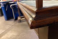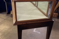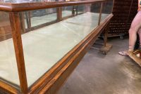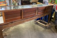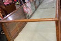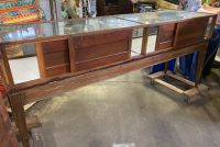 Antique general store display case and table in as found condition. Case measures 95″ long x 24″ deep x 13″ tall and table 92″ long x 23″ deep x 38″ tall. Overall in very nice condition with the exception of one missing piece of mirror on sliding back section and a small corner glass crack far right upper corner about 1/2 inch. Great for displaying collectibles or whatever……..