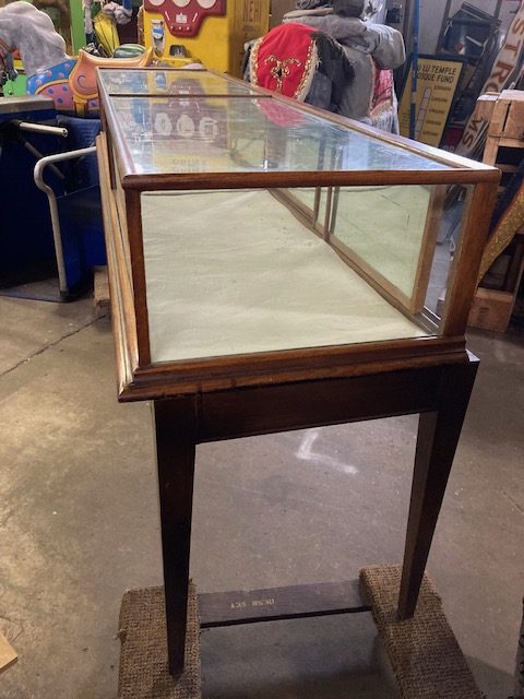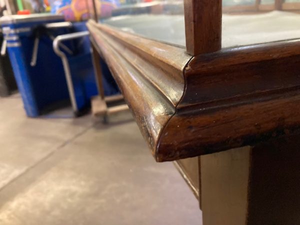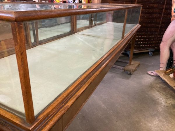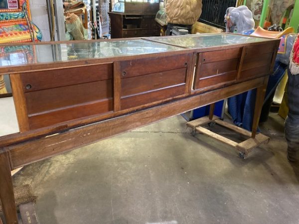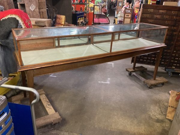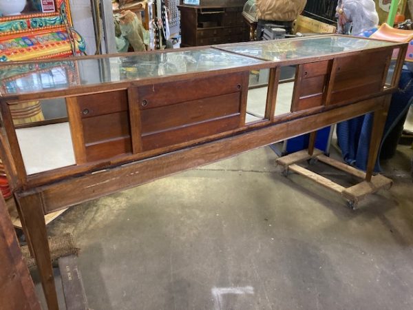 Antique general store display case and table in as found condition. Case measures 95″ long x 24″ deep x 13″ tall and table 92″ long x 23″ deep x 38″ tall. Overall in very nice condition with the exception of one missing piece of mirror on sliding back section and a small corner glass crack far right upper corner about 1/2 inch. Great for displaying collectibles or whatever……..