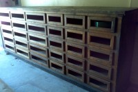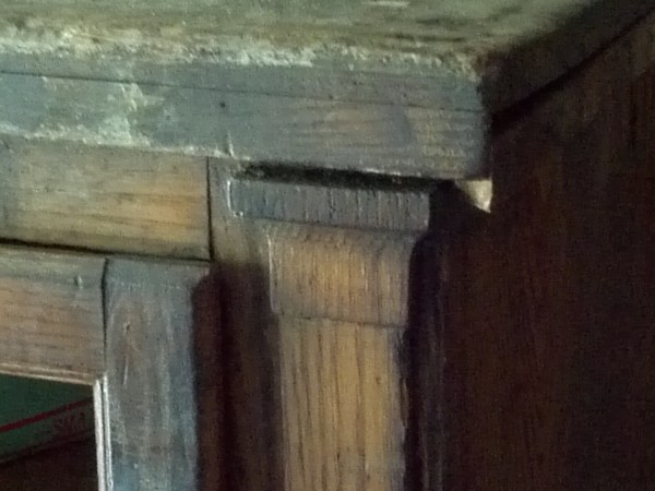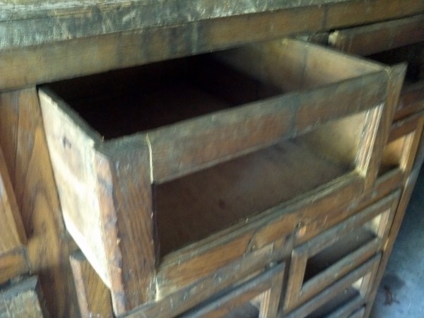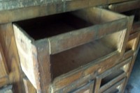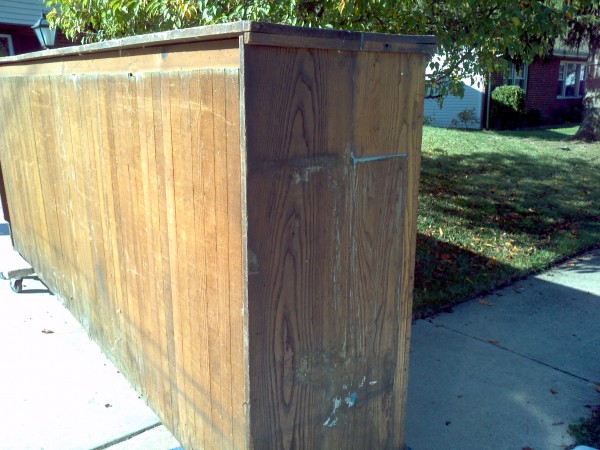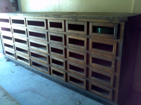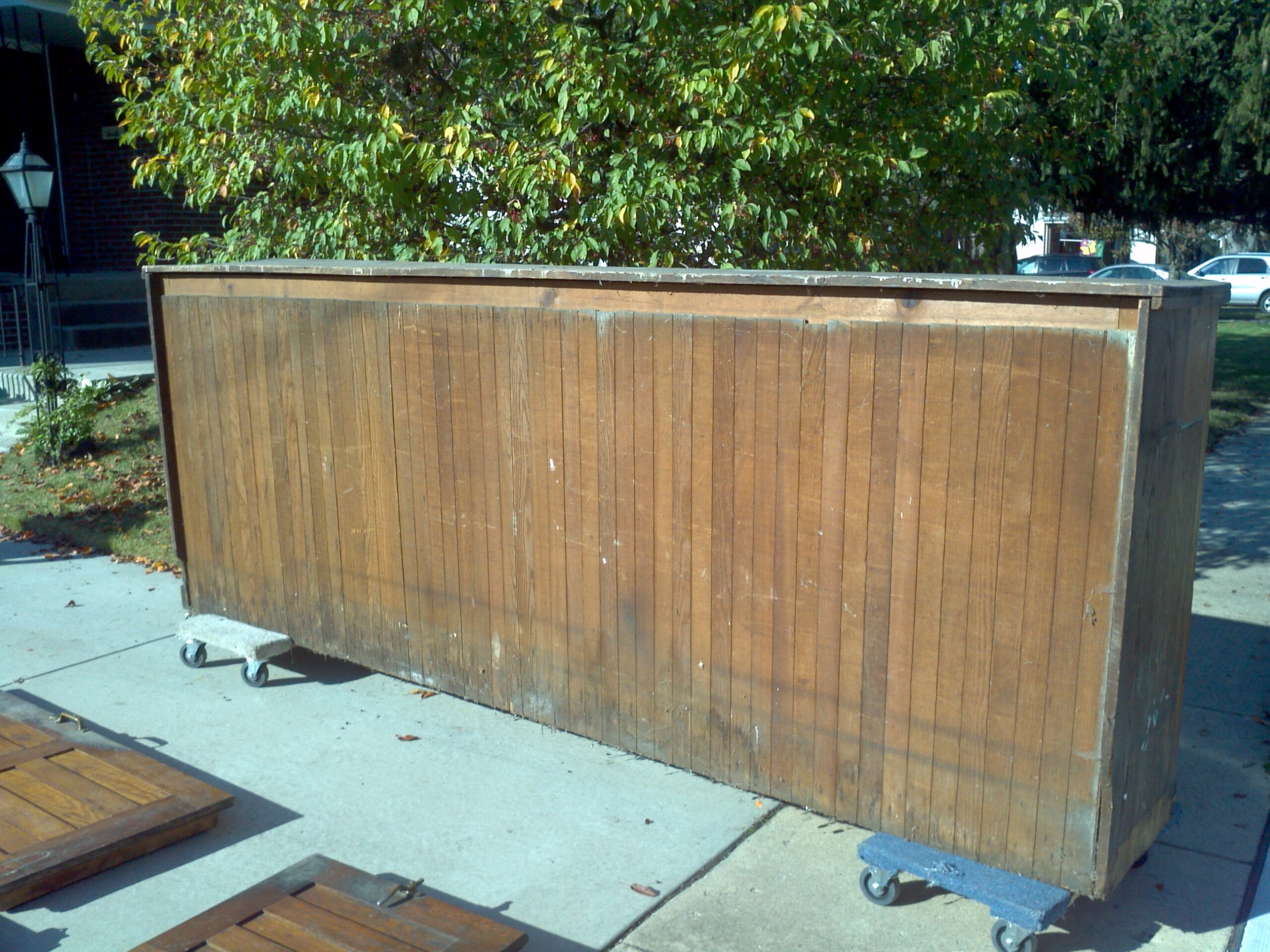 Antique general store oak cabinet in as found condition. Missing drawer glass but otherwise complete. Some of the drawer pulls are original some not. Cabinet will need to be refinished. Measures almost 12′ long. Just a wonderful kitchen item……….