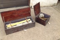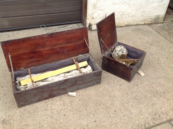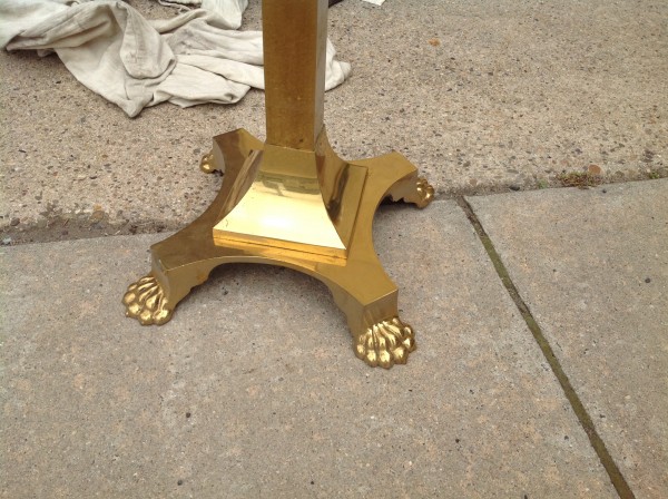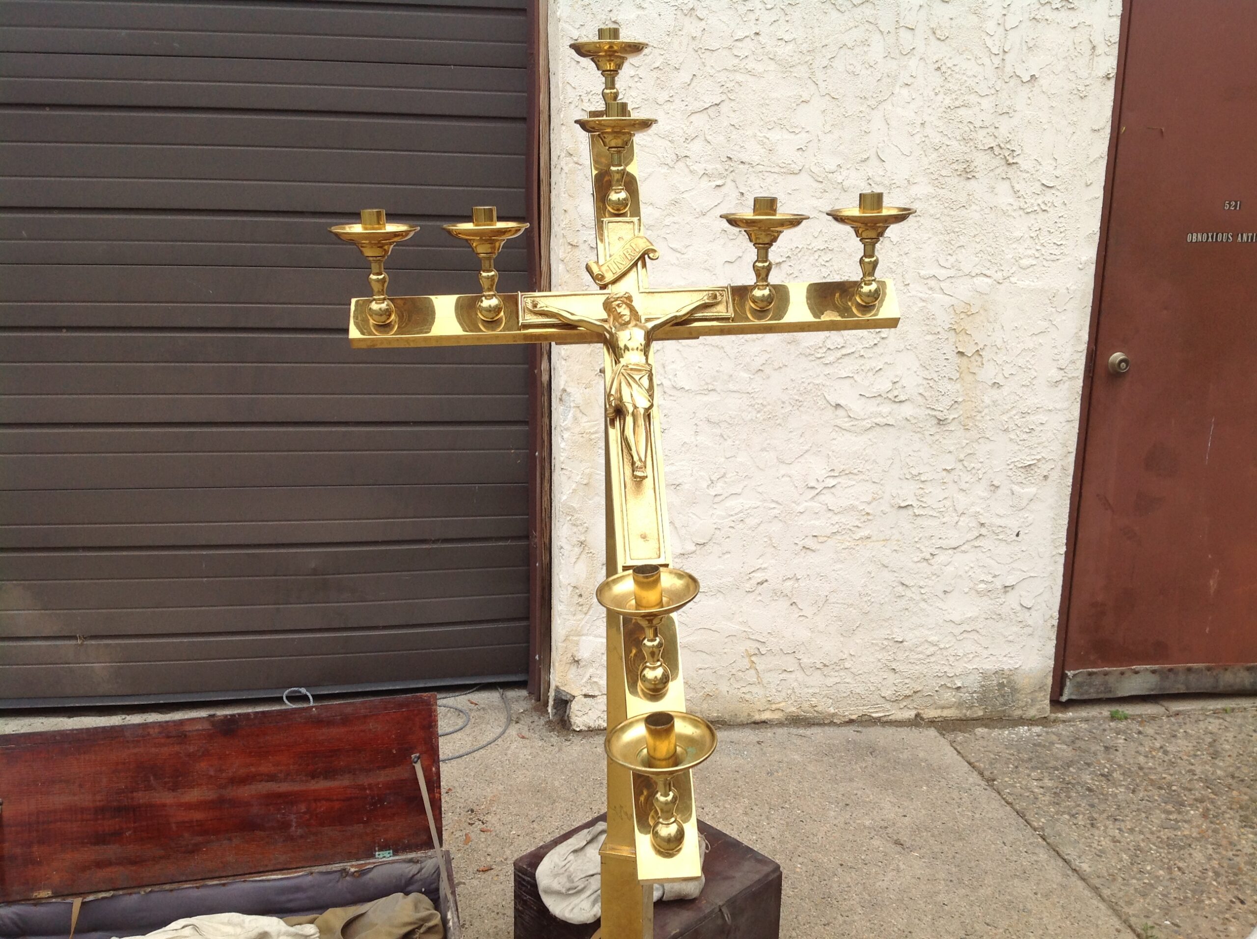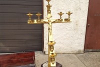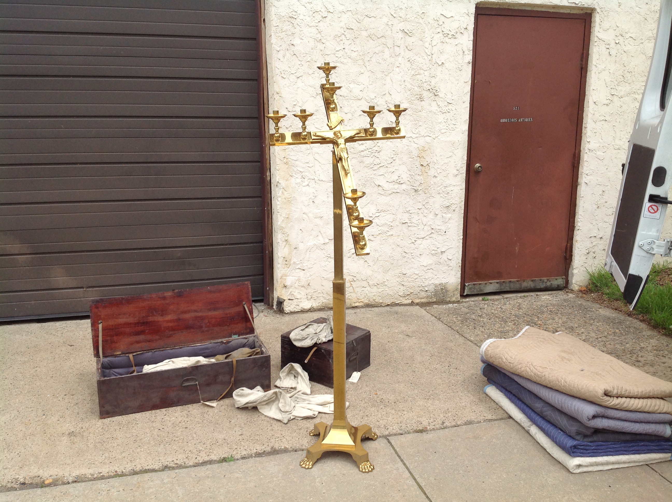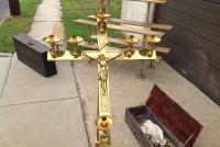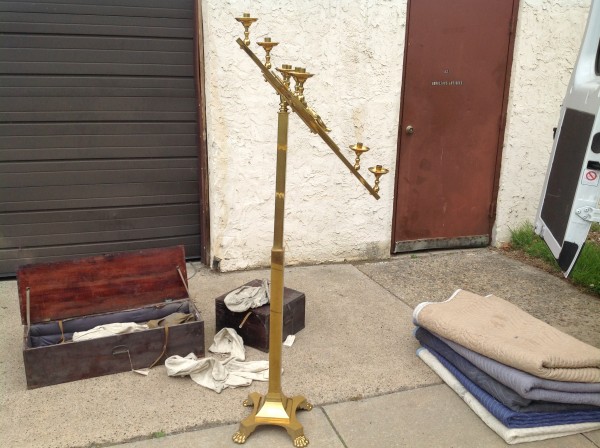 Antique gothic funeral candelabra with carry case in as found condition. Brass will need some polishing to bring out it’s beauty. Made to carry to private homes when viewings were conducted at the deceased’s house………………….
