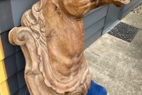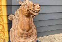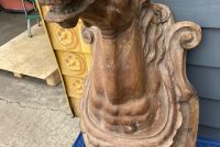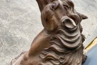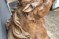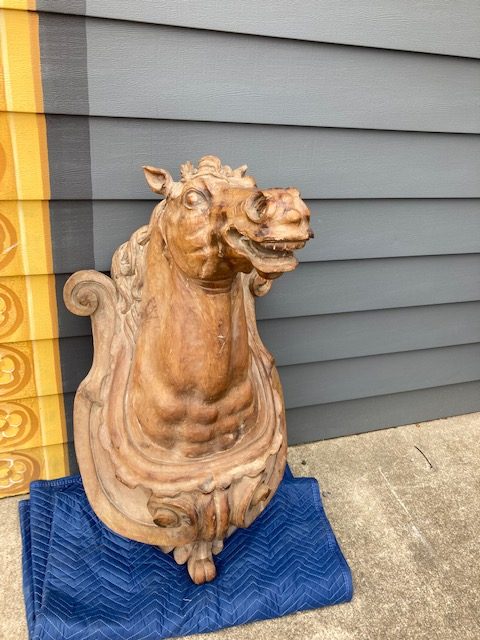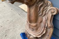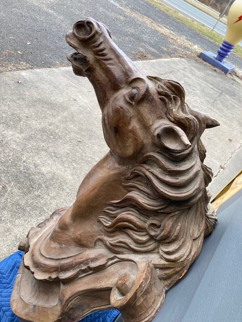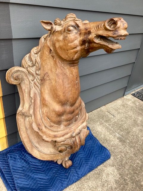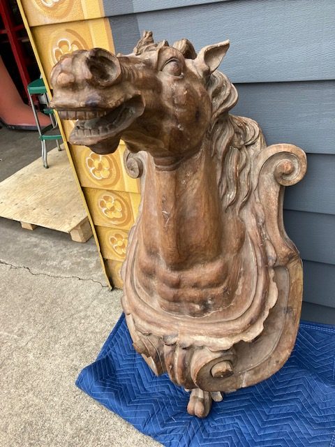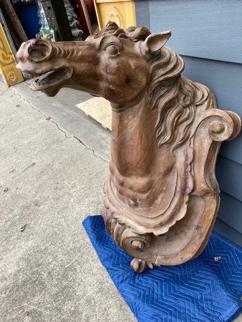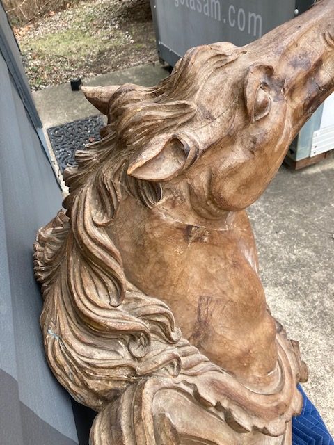 Antique Higbee’s Department Store carved wood horse head in as found condition. Very unique, believed to be one of one, carved horse head measuring 4′ high x 28″ wide x 30″ deep. Great detailing with fantastic original patina……..