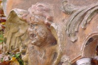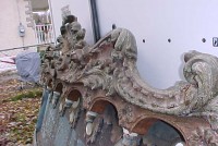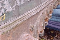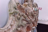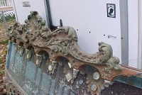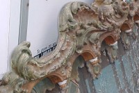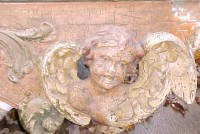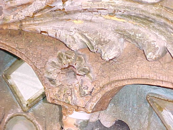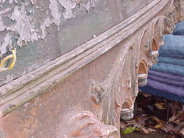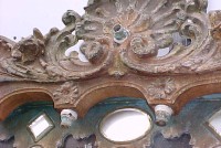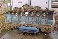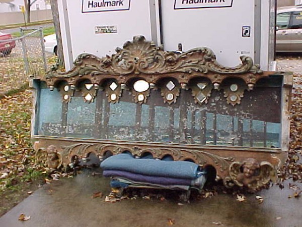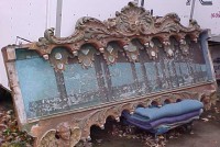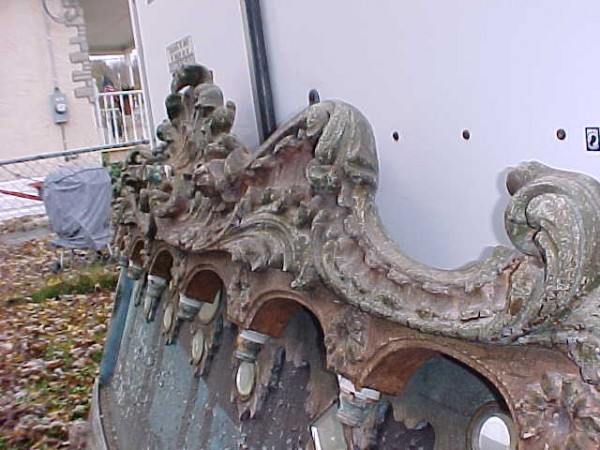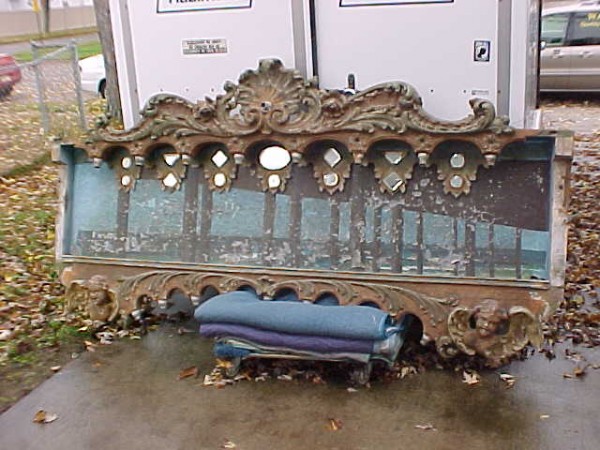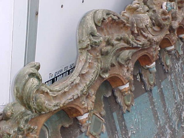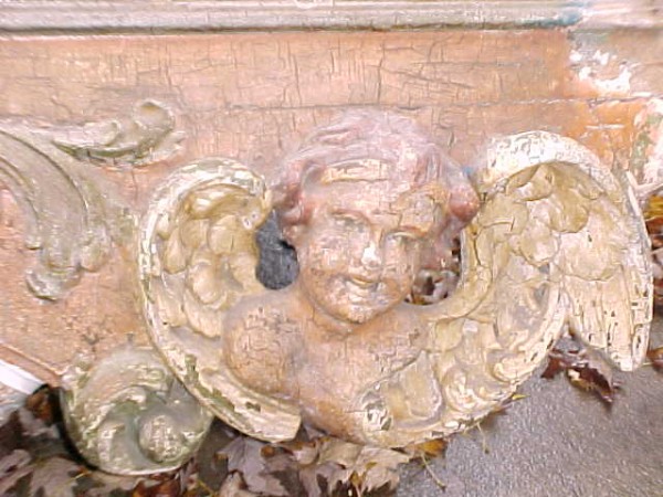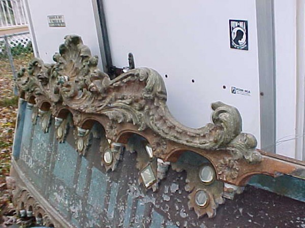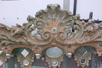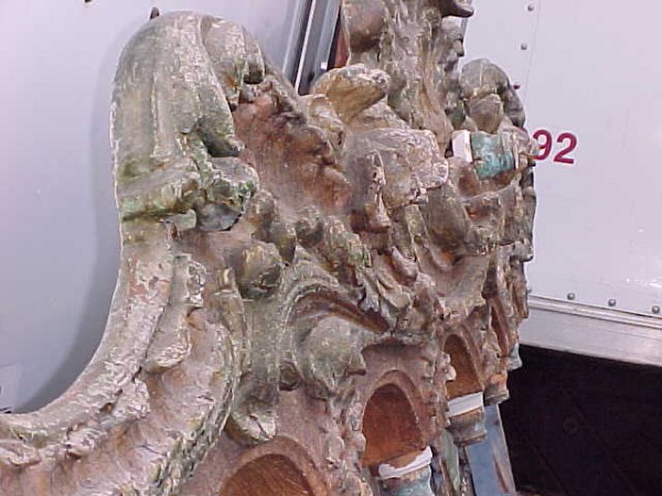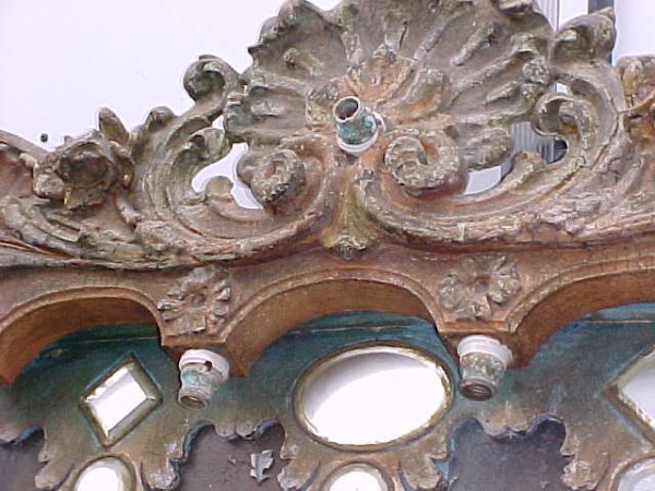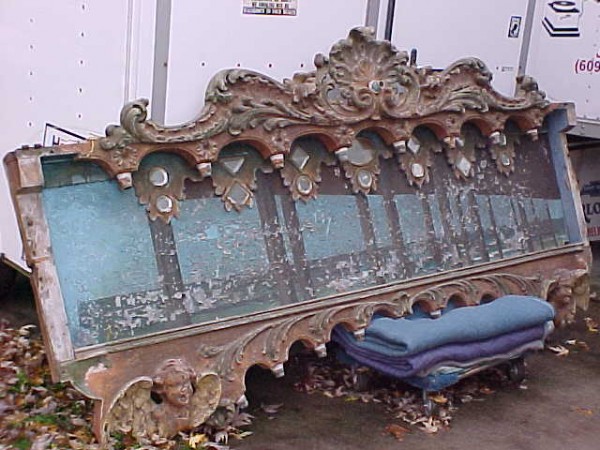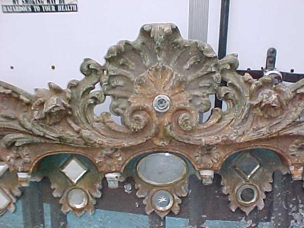 Fantastic “as found” Illions carousel rounding board. A real work of art. Measures 10′ long by 40″ high. Extremely festooned with shells, flower arabesques, daises, roses, mirror tiles, light sockets and angles with wings. Frame has early park paint and the original center painting has significant peeling. Will need restoration. A fine example of amusement park americana. Need more details, call or email…………