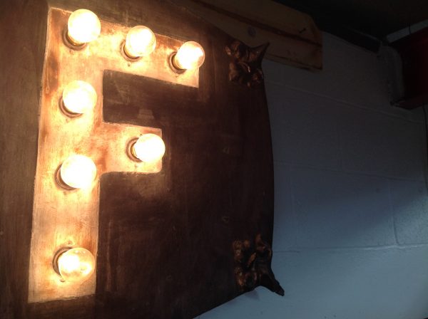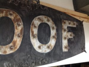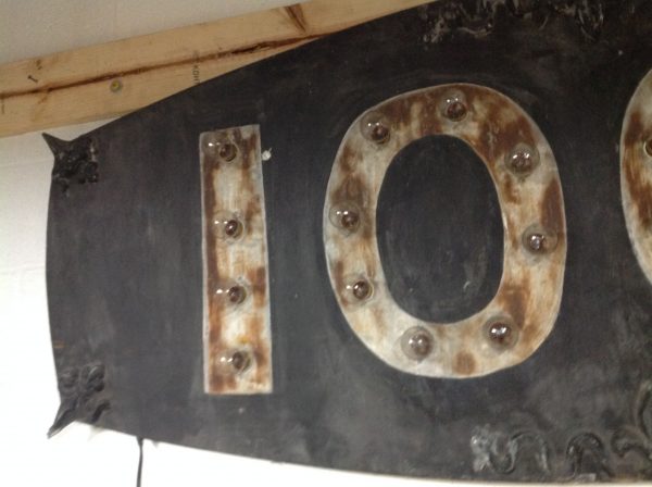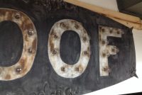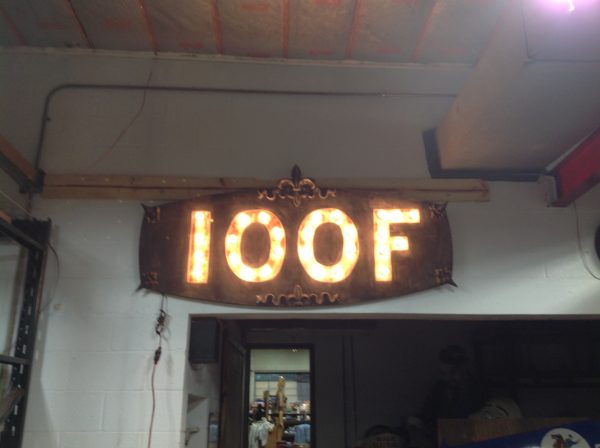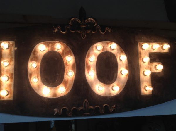 Antique metal (zinc) Independent Order Of Odd Fellows lodge sign in as found condition. Measures 70″ long x 33″ tall x 2″ deep. Just fantastic for it’s age. Great patina with new bulbs. Working condition.