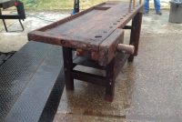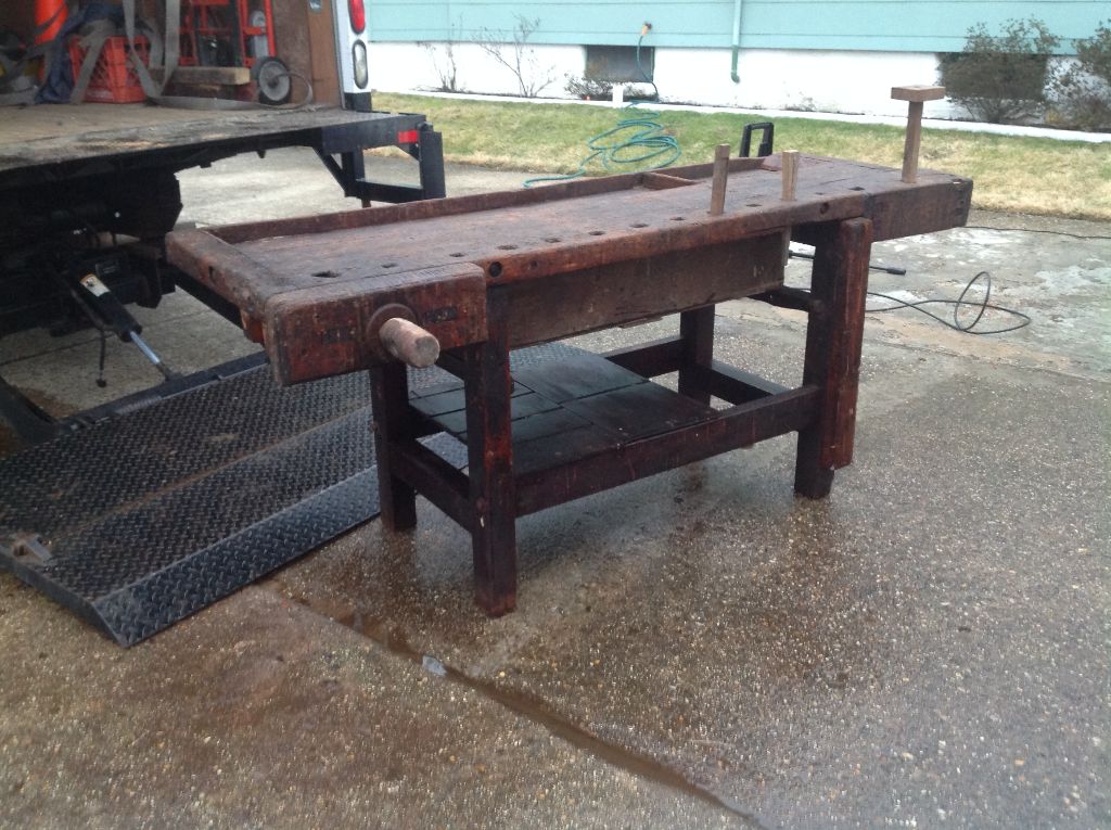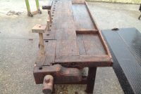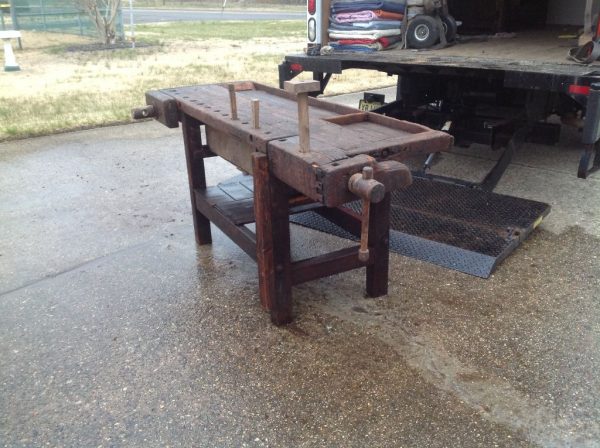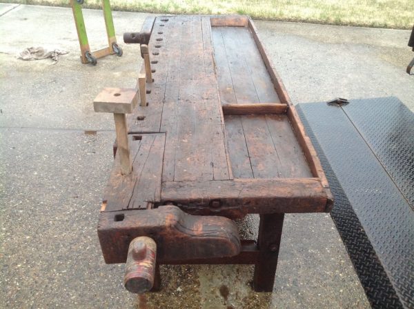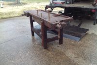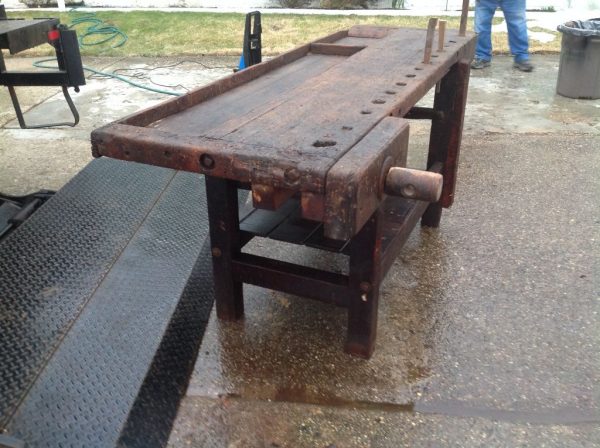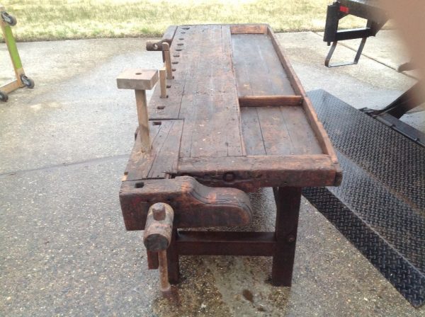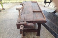 Antique, turn of the century carpenter’s workbench in as found condition. Bench will need restoration, as it’s showing age from years of use. Two vises, one working, one not. Nice old patina……..