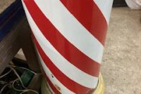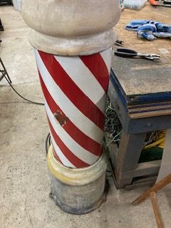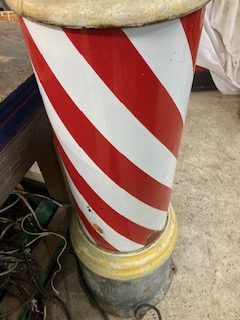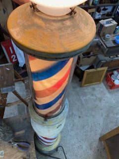 Antique floor mount key wound Barber Shop Paidar street pole in as found condition. Porcelain show signs of wear with a few chips but otherwise in nice shape. Crank her up and she spins for hours. Original key wind motor that’s hard to find on any pole. Very tall pole measuring over 8’……………