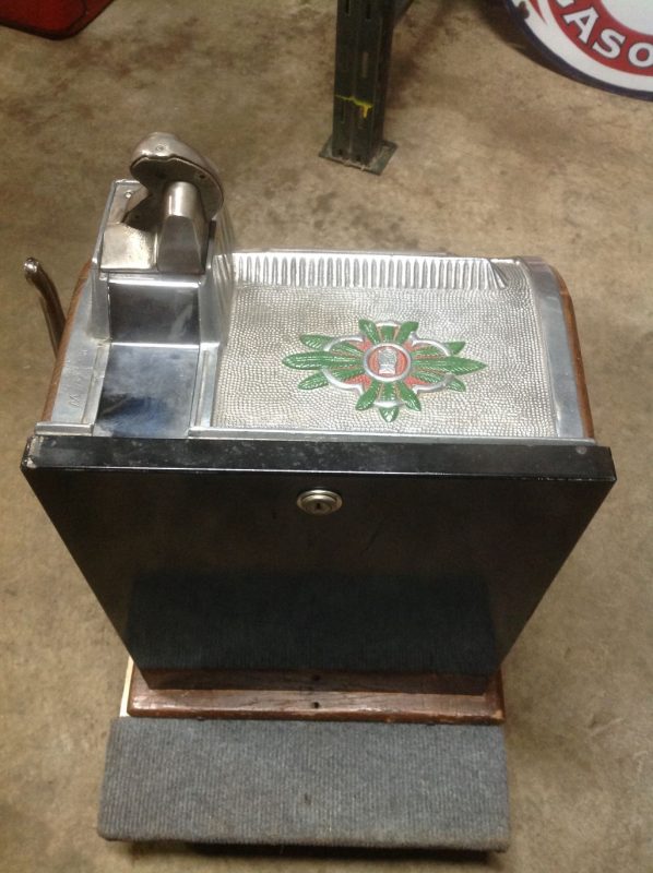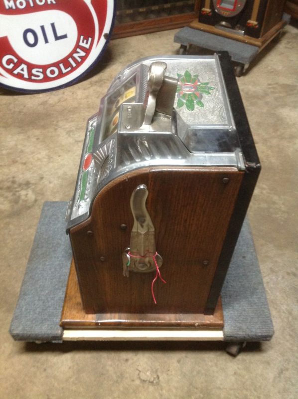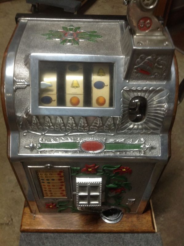 Antique 5 cent Mills Poinsettia Slot Machine in as found working condition. Complete with jackpot. Looks original with a few reproduction parts. Restored sometime during it’s lifetime……