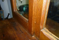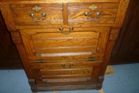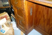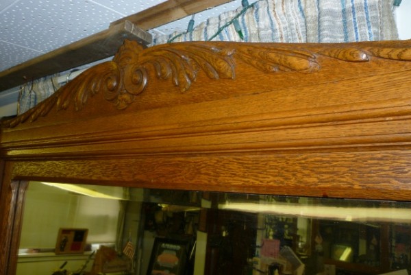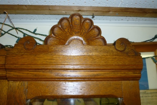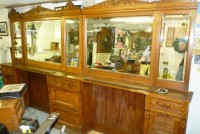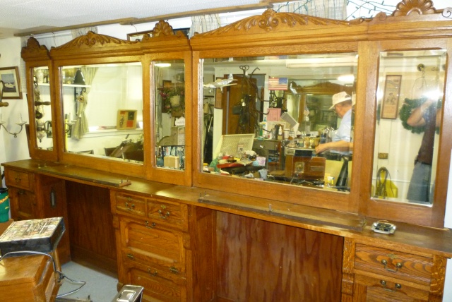 Turn of the century oak barber shop back bar. Originally located on High Street, Burlington, New Jersey. Relocated years ago after the death of the owner but now available for sale. Beveled mirrors, original hardware and detailed trim. If your looking to open a vintage shop or need something outstanding for you game room or basement don’t hesitate to call or email for more information……