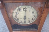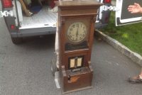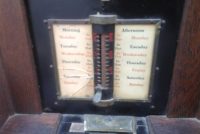 Antique oak Cincinnati time clock in as found condition. Nice overall condition except for some veneer peeling on front panel and broken glass slide. Nice decorative piece needing a good home………..