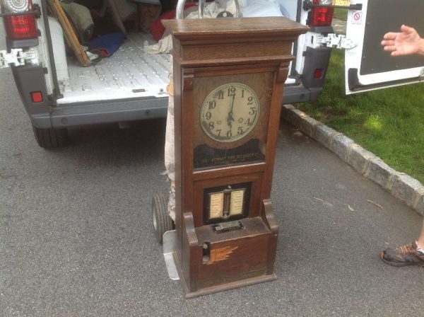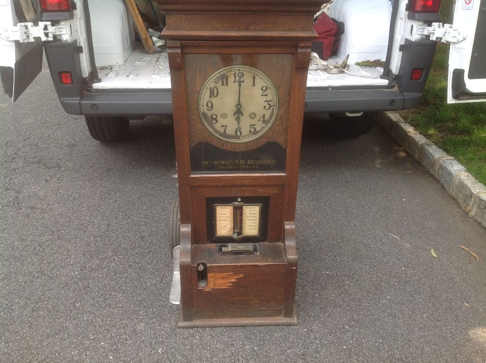 Antique oak Cincinnati time clock in as found condition. Nice overall condition except for some veneer peeling on front panel and broken glass slide. Nice decorative piece needing a good home………..