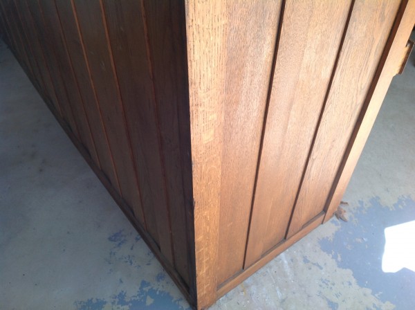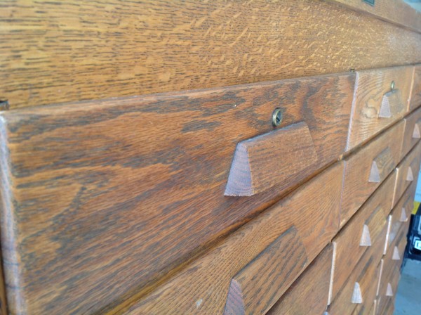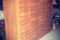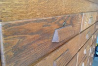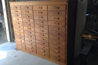 Just in, wonderful antique oak documnet file cabinet with 48 drawers. Nice old patina. Has locking drawers but no keys available. Measures 67″H x 79″L x19″D. Nice condition for its age with the exception of a few drawer pulls that are worn. Will look good in any room decor…………….