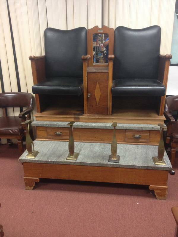 Antique Papa Bros. boot black shoe shine stand in as found condition. Manufactured in the 1940’s by Papa Bros., New York for the intended use to shine shoes in a high end Newark, New Jersey shoe store. Moved in the 1960’s to shoe store in South Jersey where we found it in a back room filled with old used shoes. Brass and marble two station stand needing a little staining and polishing to bring out it’s full beauty. Nice gameroom piece…………