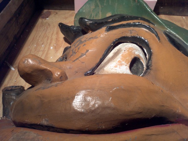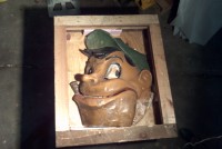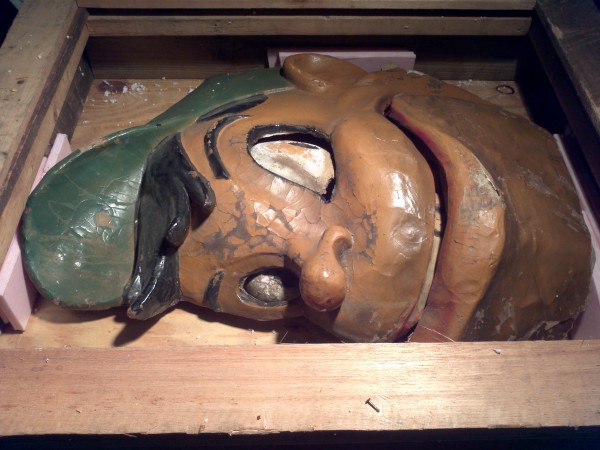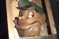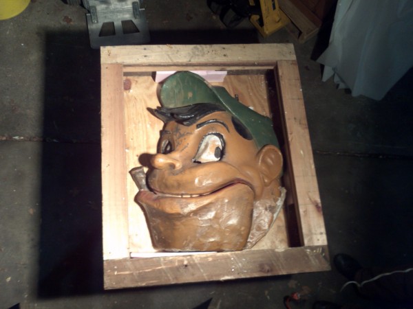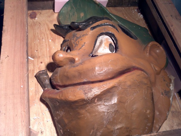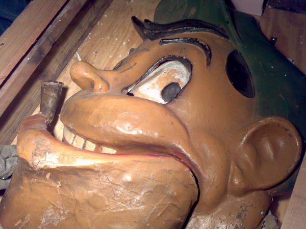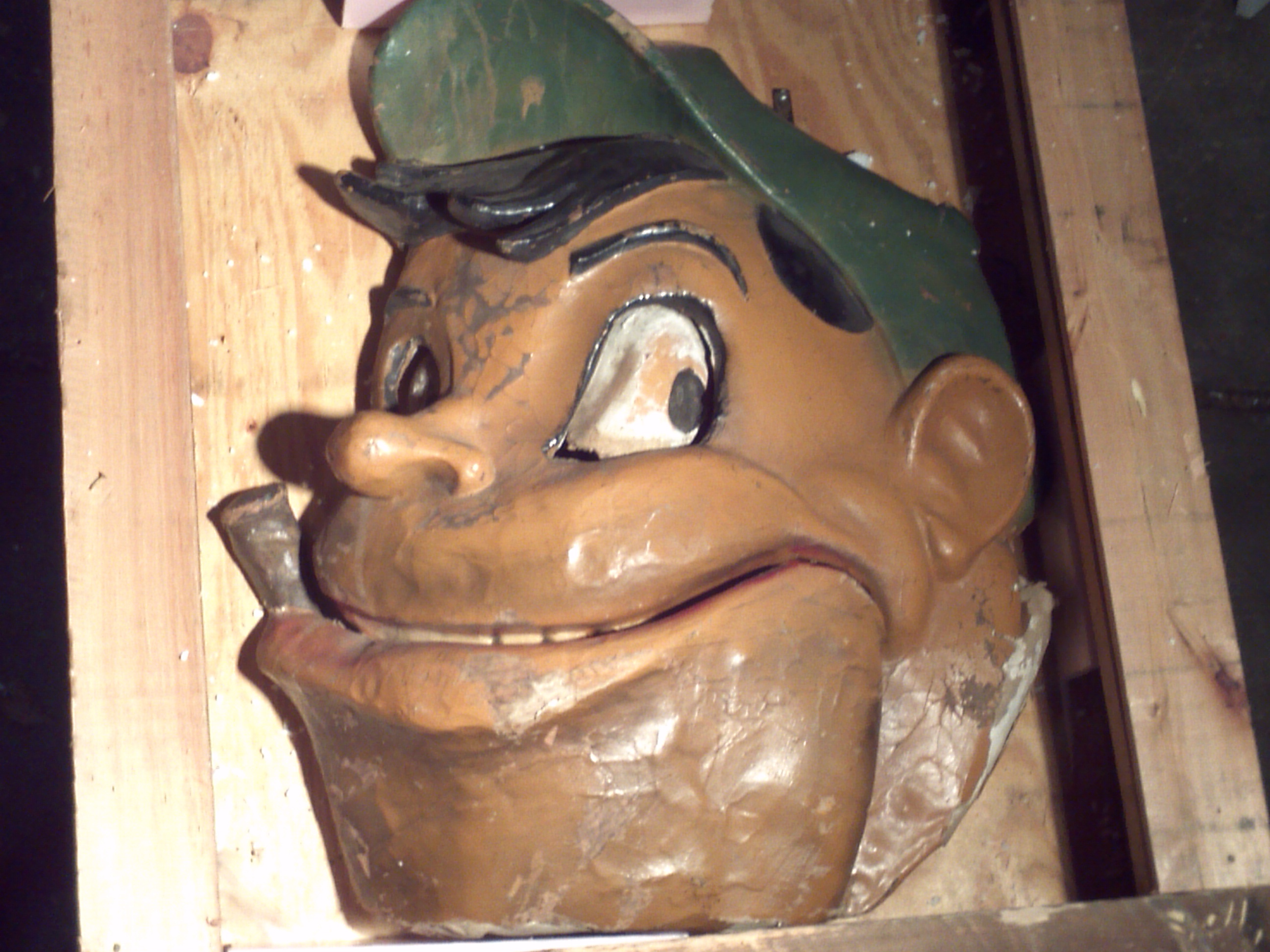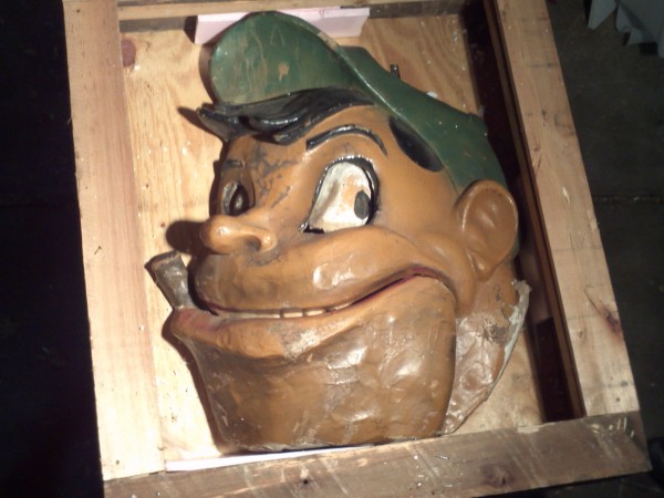 Wonderful old antique 1920’s papier mache funhouse automaton of man’s head in as found condition. Head has some flaws and will need restoration. The mechanism that animated the head is gone but the linkage is there. Manufactured by the Old Kind Cole Company, Canton, Ohio.Measures 30″ x 36″. Rare and hard to find in this condition. A true collectible…..