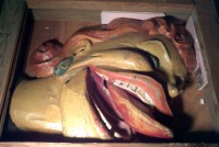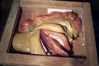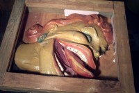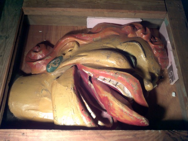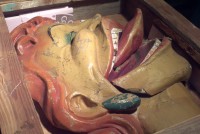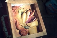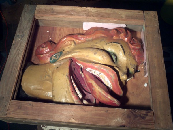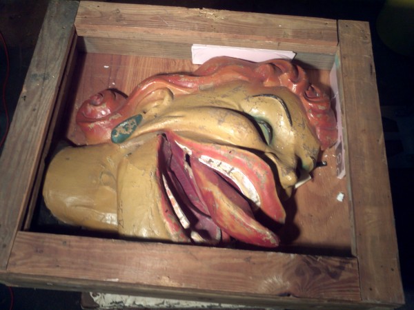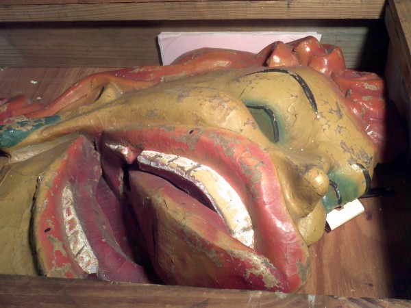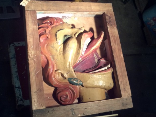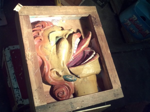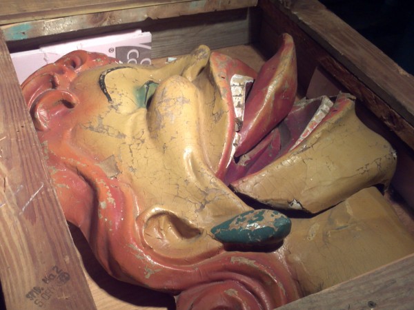 Fantastic 1920’s antique papier mache funhouse automaton of woman’s head in as found condition. Manufactured by the Old King Cole Company of Canton, Ohio. Head has some peeling and will need restoration. The mechanism that animated the piece is gone but all the linkage to bring it back to its original condition is there. Measures approximately 30″ x 36″. If you collect papier mache you need this for your collection…….