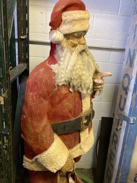 Fantastic rare antique paper mache window display animated Santa in as found working condition. Shows some wear but overall in near excellent condition for his age. Looks all original, standing almost 5′ tall. If you collect Santa’s, animated figures, automatons or paper mache this Jolly Fella should be part of your collection……..