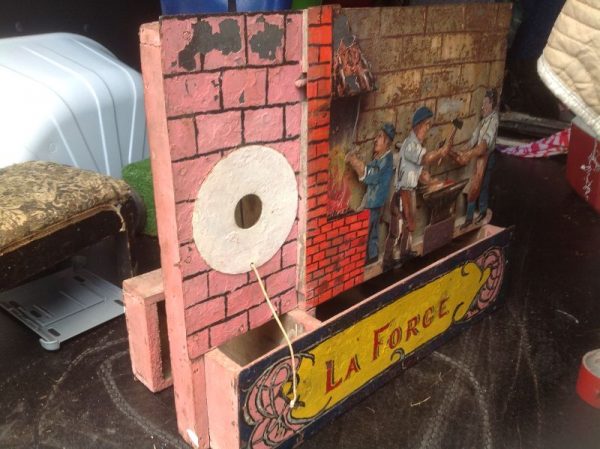 Antique penny arcade shooting gallery animated target in as found condition. Nice patina with minor paint loss. Working condition. Believed to be French….