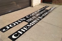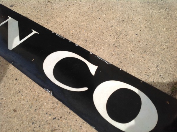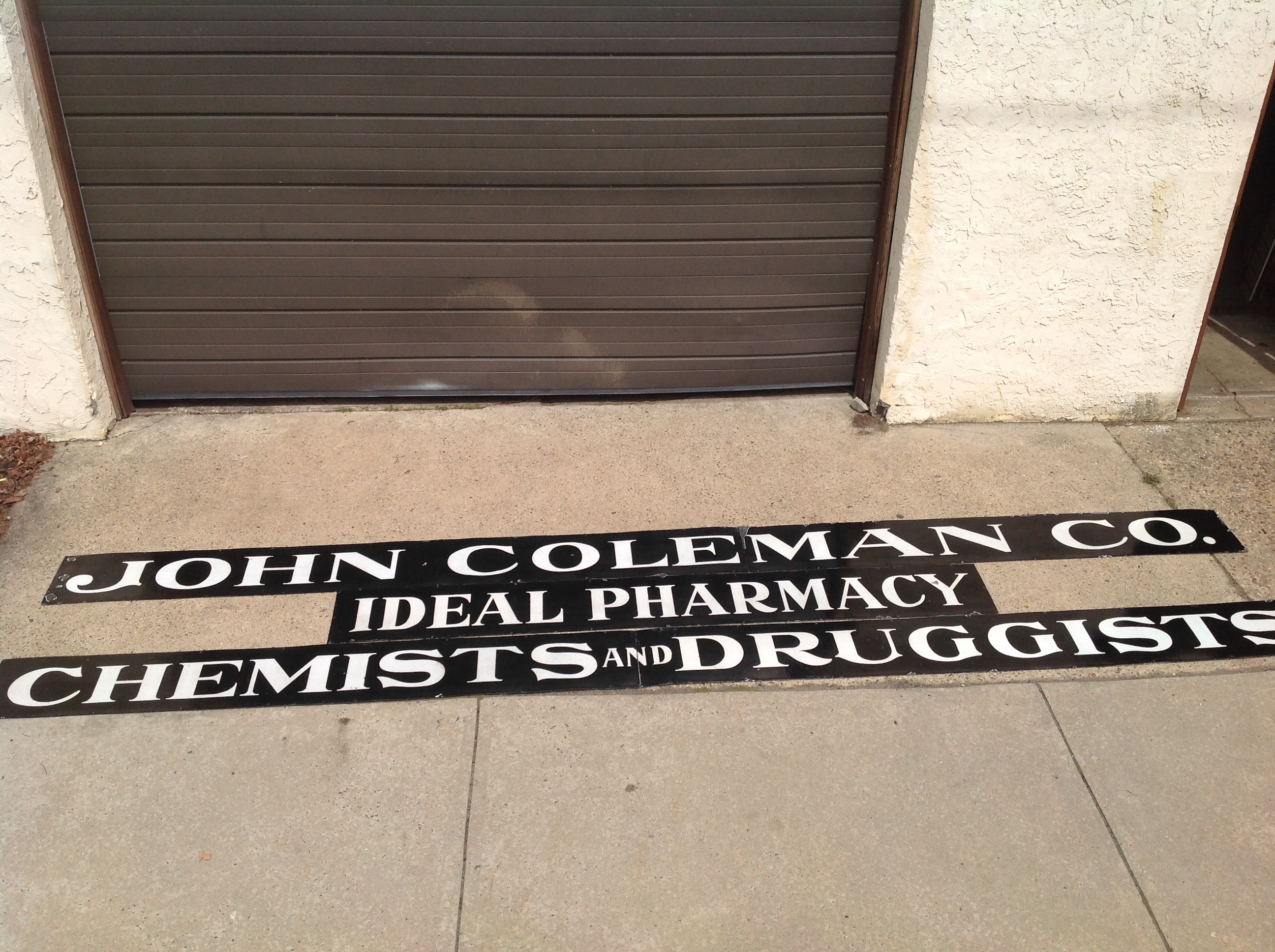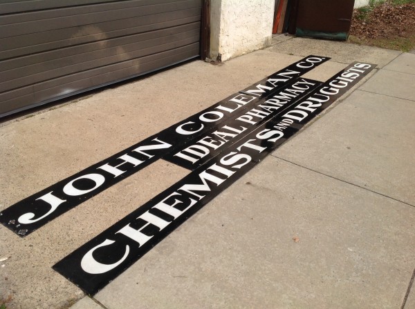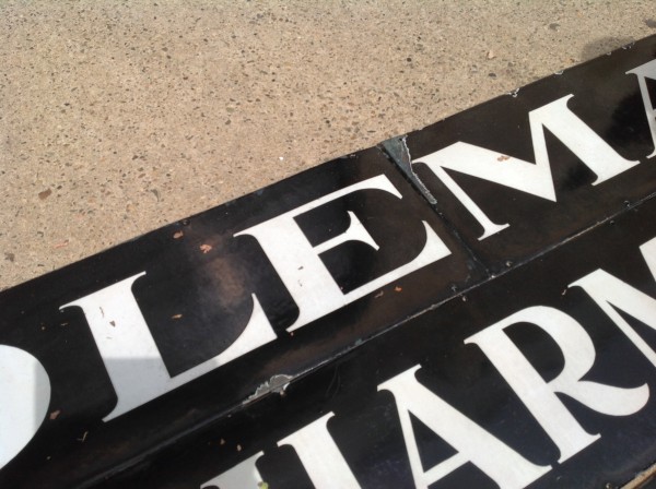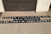 Antique porcelain over steel pharmacy, apothecary, chemist advertising sign measuring in total lenght over 41′ long. Sign has some very minor chipping but overall nice condition with bright colors. Sign was from an old brick building near Wheeling, WV, where John Coleman Co. operated a business……………..
