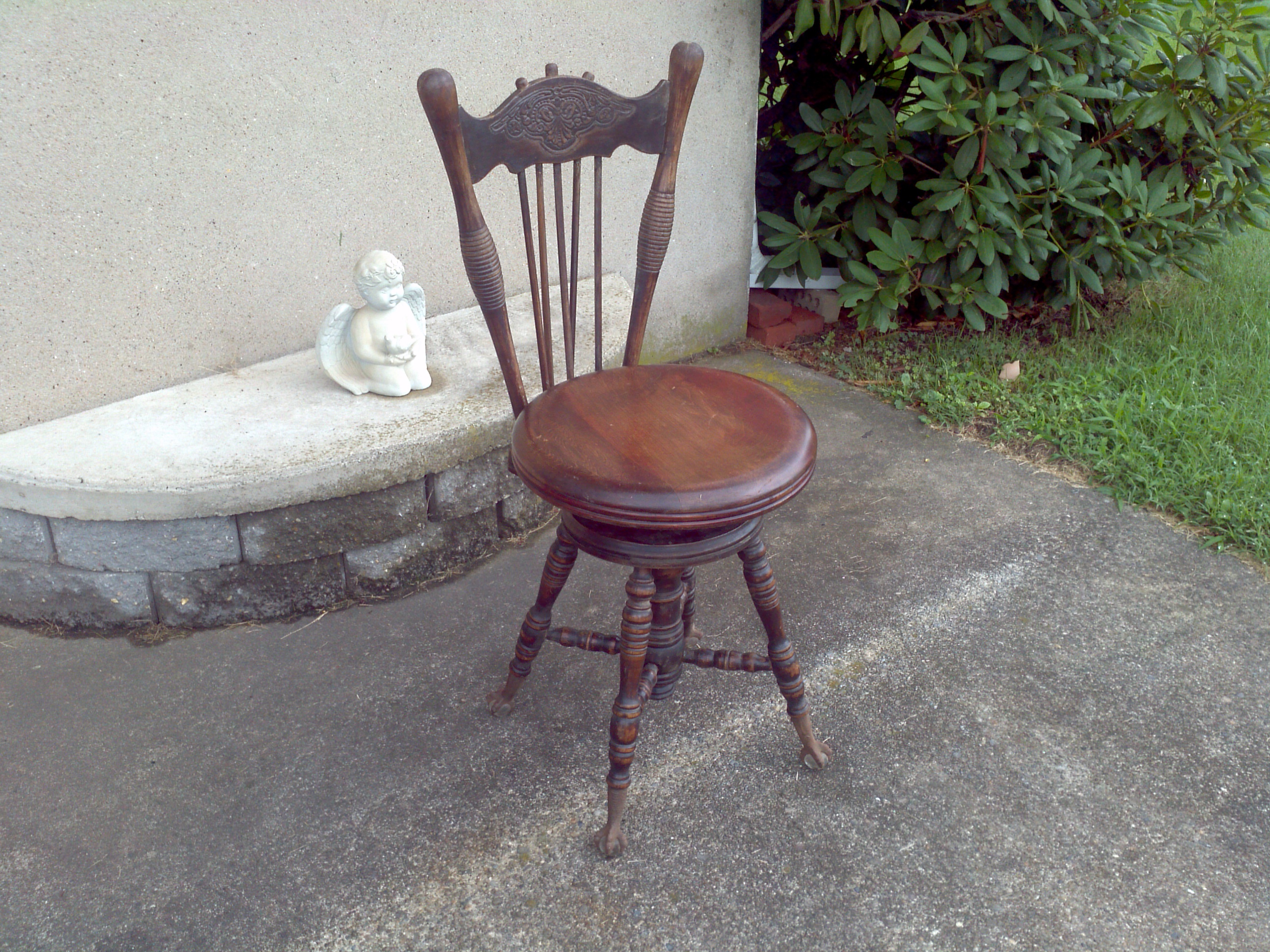 Antique high back piano stool with lion claw feet in as found condition. Will need to be tightened up a bit but otherwise in good condition. Could also use a good refinishing. Nice for that small spot in any room……..