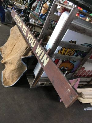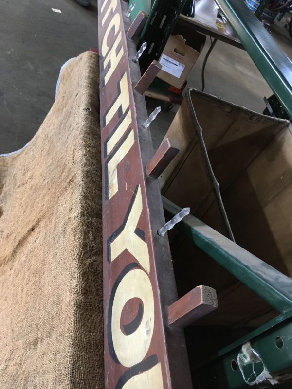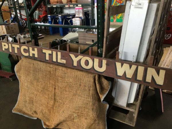 Antique heavy wood hand painted Pitch Til You Win sign measuring almost 12′ long in as found condition. Found in an old upstate Pennsylvania carnival salvage yard. Neat old sign…….