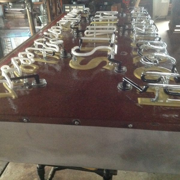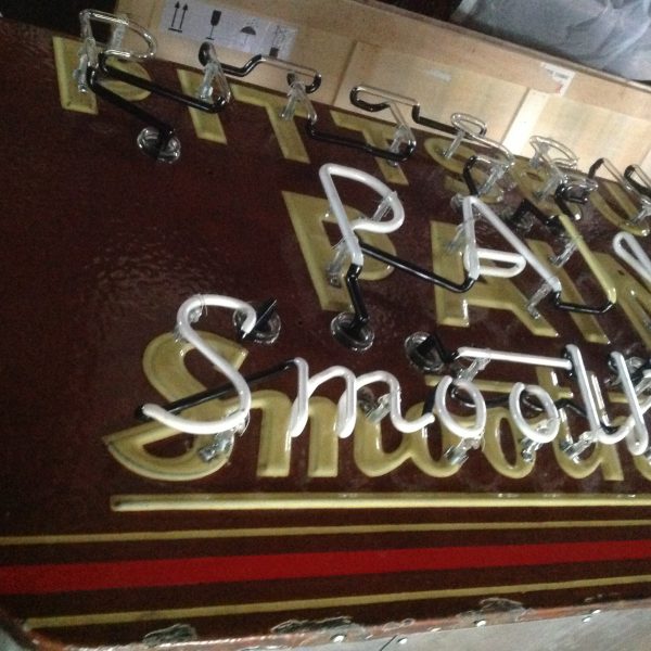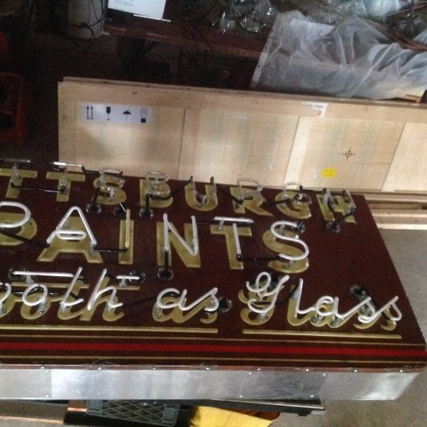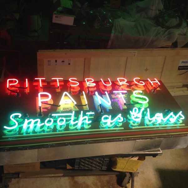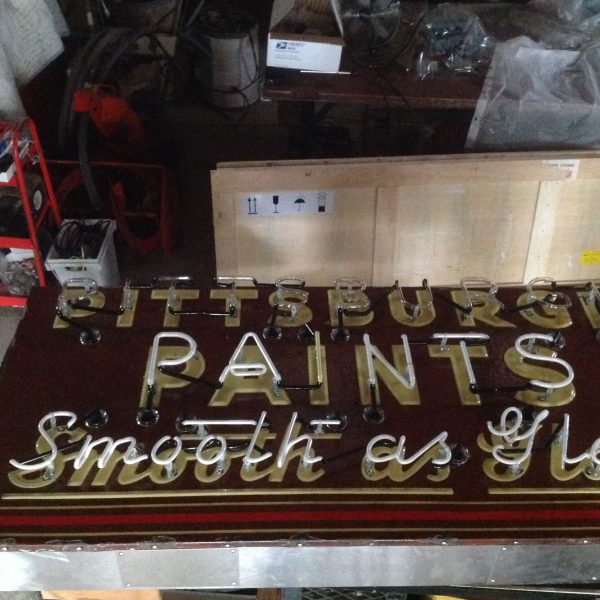 Antique Pittsburgh paints porcelain over steel neon store sign in restored condition. New can and neon makes this sign a great addition to your sign collection. Measures about 6′ long x 30″ high. Nice porcelain front…………..