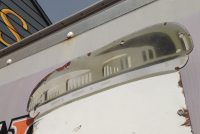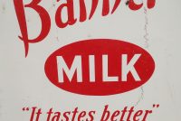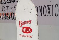 Antique porcelain Banner Milk Bottle advertising sign in as found condition. Measures 80″ high x 36″ wide, showing signs of wear with surface chips and cut at lower right corner as shown in photo. Will display well…………